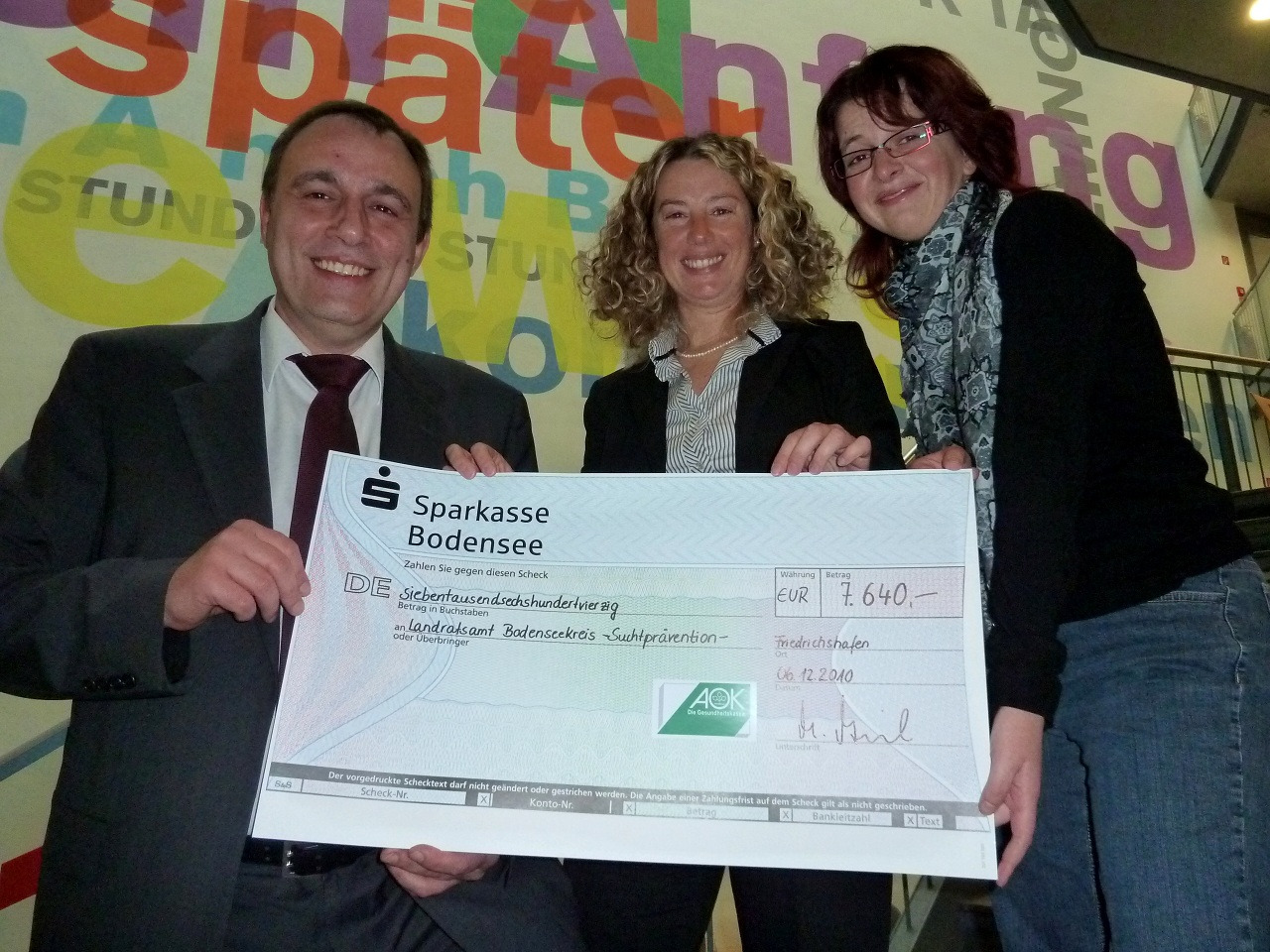 Die Allgemeine Ortskrankenkasse (AOK) Friedrichshafen hat am Montag (6. Dezember 2010) eine Spende in Höhe von 7640 Euro an das Landratsamt des Bodenseekreises übergeben. Das Geld soll für Projekte der Suchtprävention bei Jugendlichen eingesetzt werden. Daniela Sprinz, Leiterin des AOK- Kundencenters in Friedrichshafen, übergab den symbolischen Scheck mit den Worten „Wir unterstützen gerne die Präventionsarbeit des Landratsamts, denn Vorbeugen ist bekanntlich besser als Heilen, auch beim Thema Alkohol und Drogen.“ Die Projekte und Ideen des Landratsamts zeichneten sich dadurch aus, dass man nicht mit erhobenem Zeigefinger agiere, sondern die Jugendlichen in deren täglicher Lebenswelt erreichen wolle, so Sprinz weiter.