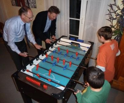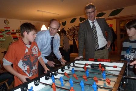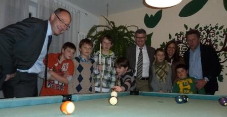 Die Jungen waren offenkundig sehr gespannt auf den Besuch aus Rathaus und Landratsamt. „Ich kenne Sie aus der Zeitung“, sagte einer der Jungen zum Landrat, als er diesem sein Zimmer zeigte. Richtig zur Sache gehen sollte es aber am Kicker- und Billardtisch im großen Wohnzimmer des Kastanienhofs: In gemischten Teams spielten Wölfle und Amann mehrere Runden und mussten dabei auch einige gegnerische Punkte verbuchen.