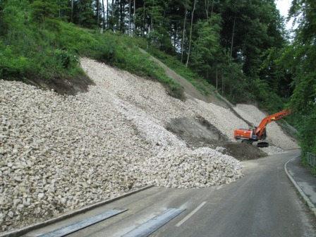In den vergangenen Tagen sind die abgerutschten und rutschgefährdeten Erdmassen durch einen Langstilbagger abgetragen und der Hang im unteren Drittel mit rund 600 Tonnen Grobschotter stabilisiert worden. Der verbleibende obere Hangbereich ist jedoch auch für diesen speziellen Bagger nicht erreichbar. Abhilfe könnte ein engmaschiges Netz aus Stahlseilen schaffen, das über diesen oberen Hangbereich gespannt und tief verankert wird. Solche Netze stabilisieren die Oberfläche und verbessern zudem den Halt für den Pflanzenbewuchs. Da diese Arbeiten durch Spezialisten in Handarbeit erledigt werden müssen, ist solch eine Maßnahme allerdings sehr teuer.