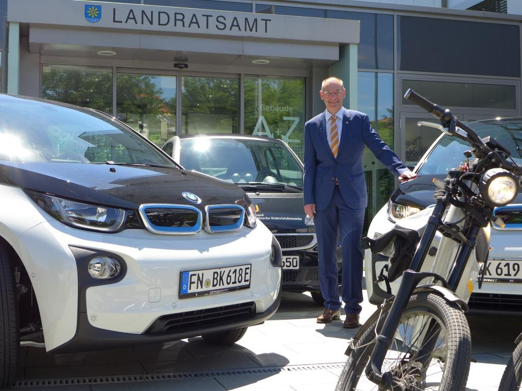 Das Landratsamt Bodenseekreis fährt immer elektrischer. Denn nun gibt es in der Dienstwagenflotte der Kreisbehörde zwei neue Elektroautos vom Hersteller BMW. Die Viersitzer vom Typ i3 haben eine Normreichweite von 190 Kilometern, also genug für die Dienstfahrten im Landkreis. Die Mitarbeiter des Amts können die bis zu 150 Stundenkilometer schnellen Flitzer über ein Buchungsprogramm reservieren und dann für ihre behördliche Arbeit nutzen. „Unsere Elektrofahrzeuge sind sehr beliebt, denn die Kolleginnen und Kollegen sind gerne mit der neuen Technik unterwegs und auch ein bisschen stolz darauf“, sagt Landrat Lothar Wölfle. Neben den beiden Leasing-BMW ist die Behörde auch mit einem Nissan aus dem Projekt emma (Elektromobilität mit Anschluss) sowie einem Smart und zwei Kleinmotorrädern (E-Bikes) elektrisch mobil.