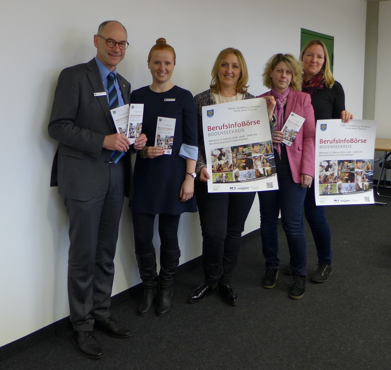 Bildinfo: Landrat Lothar Wölfle, Simone Schlachter von der Bildungsregion Bodenseekreis, Schulleiterin Angelika Seitzinger und die BIB-Koordinatorinnen Diana Schneider und Kristina Rex (v. l.) laden Schülerinnen und Schüler aller Schularten sowie Eltern und Lehrkräfte zur BerufsInfoBörse am 6. Februar 2019 in Friedrichshafen ein.