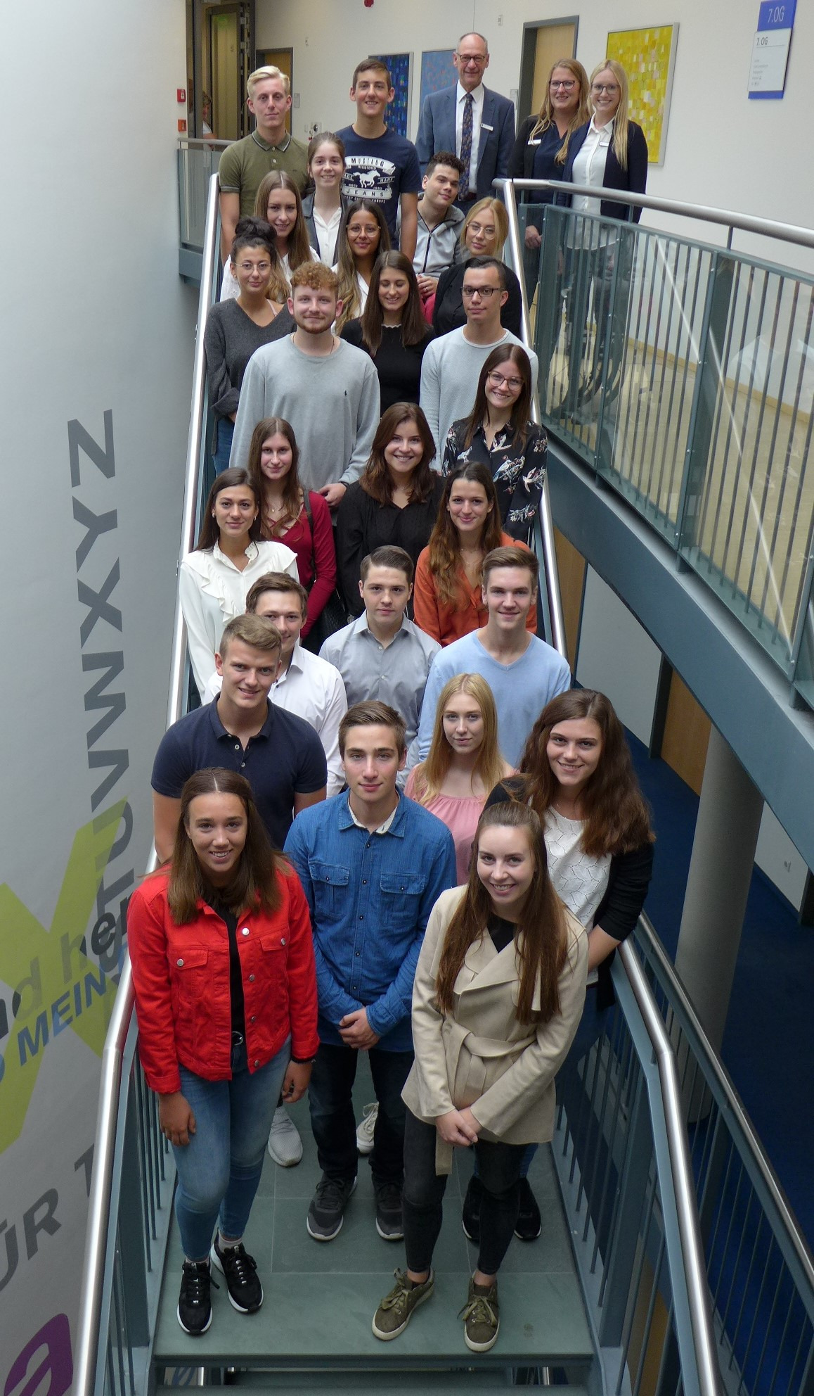 Bildinfo: Ein neuer Lebensabschnitt beginnt: der Auszubildenden-Jahrgang 2019 an seinem ersten Tag im Landratsamt, gemeinsam mit Landrat Lothar Wölfle, Personalentwicklerin Nadine Hommel und Ausbildungsleiterin Bettina Hirschle (oben rechts).