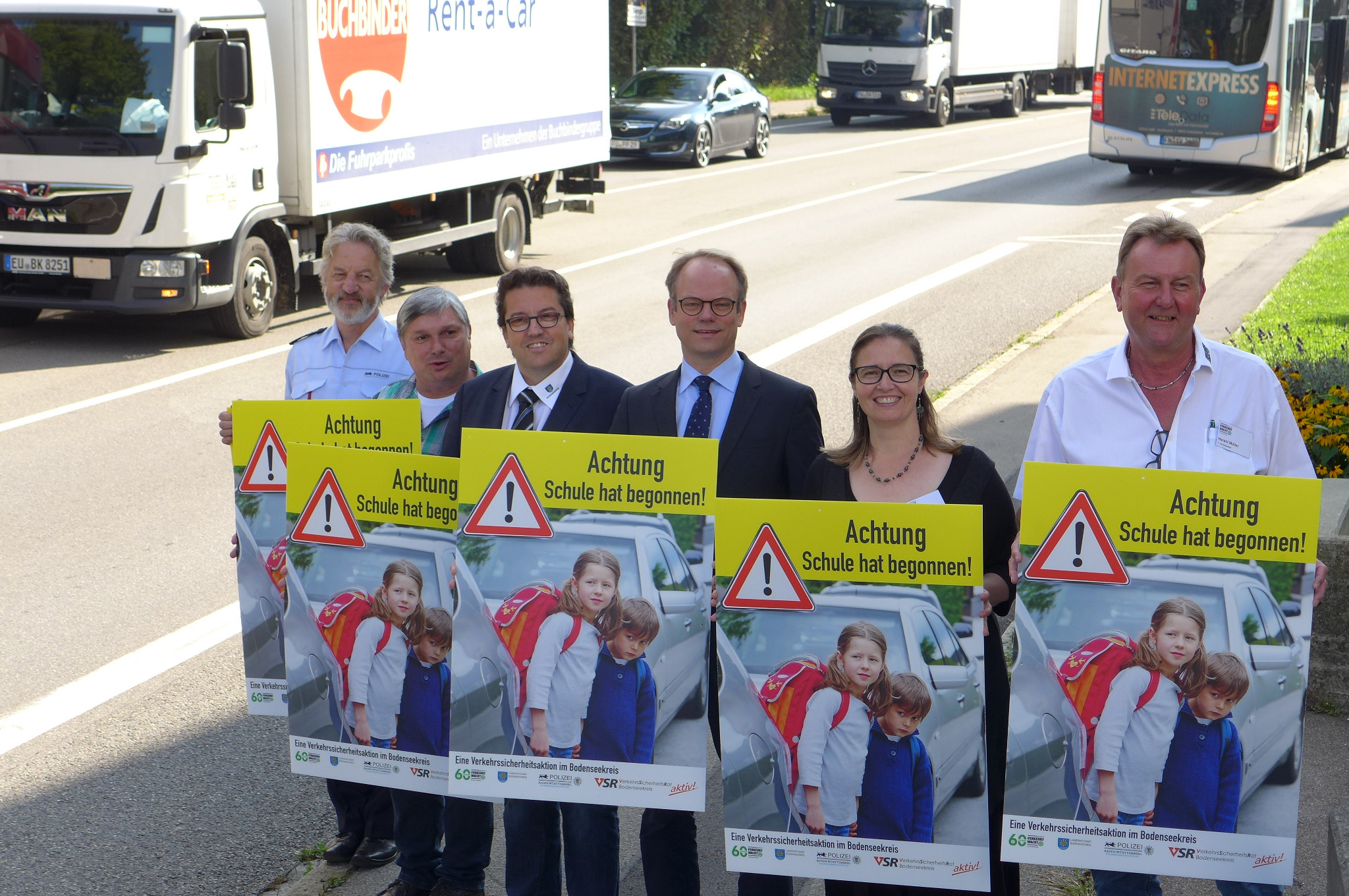 Bildinfo: Wollen Autofahrer auf den Schulanfang aufmerksam machen: (v.r.) Harald Müller und Stefanie Thaler von der Verkehrswacht, Christoph Keckeisen, Dietmar Buck und Frank Decker vom Landratsamt Bodenseekreis sowie Peter Härle von der Polizei.