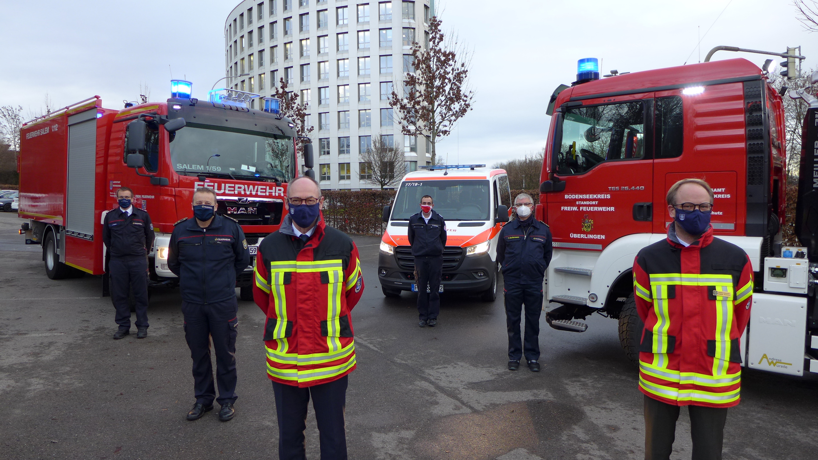 Der Katastrophen- und Bevölkerungsschutz im Bodenseekreis verfügt über drei neue Einsatzfahrzeuge. Die beiden LKW und der Kleinbus wurden durch Landrat Lothar Wölfle und Christoph Keckeisen, dem zuständigen Dezernenten des Landratsamts, und Kreisbrandmeister Peter Schörkhuber am Dienstag (22. Dezember 2020) offiziell an die Blaulichtorganisationen übergeben. Rund 645.000 Euro Anschaffungswert hat das rollende Material, die in unterschiedlichen Abstufungen durch das Land, den Landkreis und eine Stationierungsgemeinde getragen werden.
