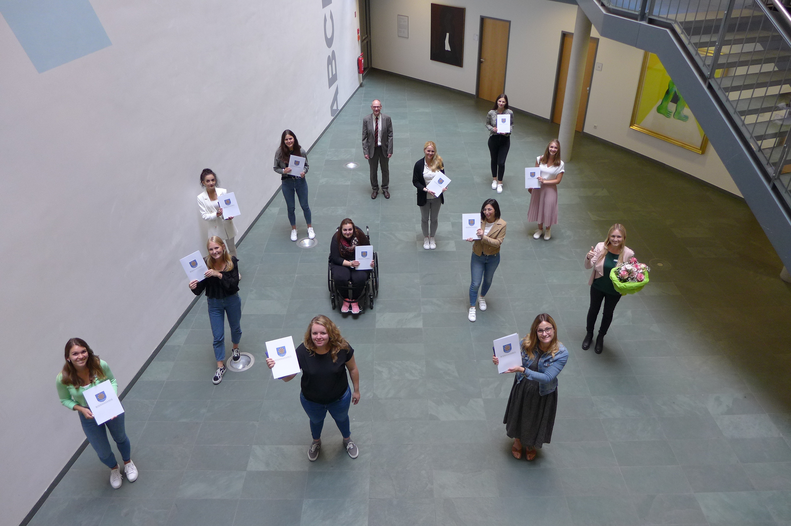 Zwölf Auszubildende haben im Juli 2021 im Landratsamt Bodenseekreis erfolgreich ihre Ausbildung zur Verwaltungsfachangestellten abgeschlossen. Zum guten Abschluss gratulierte Landrat Lothar Wölfle persönlich und überreichte den Absolventinnen ihr Zeugnis und ein kleines Präsent. Ganz besonders freut sich auch Ausbildungsleiterin Bettina Hirschle, denn alle zwölf jungen Kolleginnen haben das Angebot des Landratsamtes zur Übernahme in ein Arbeitsverhältnis angenommen.