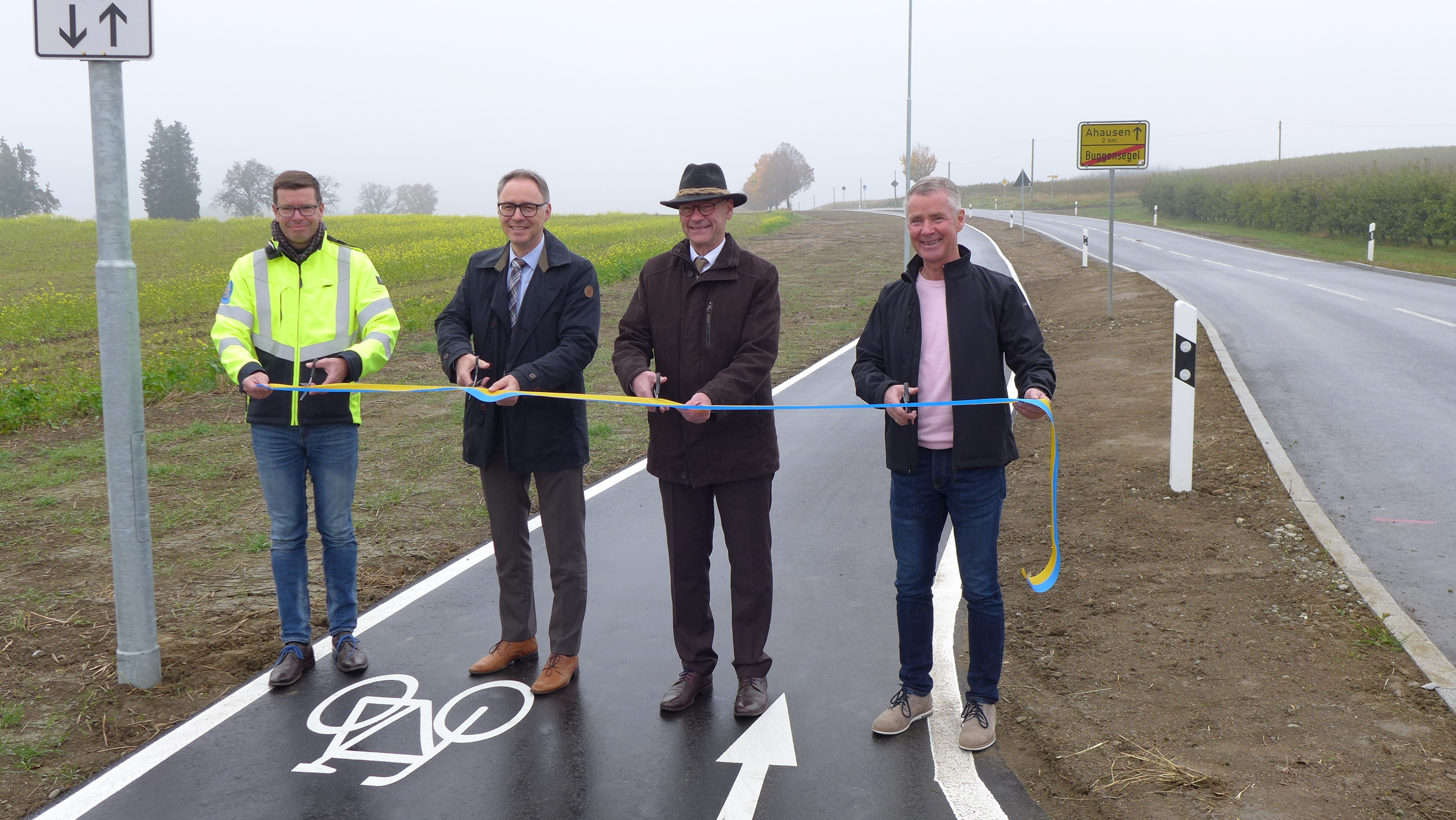 Bildinfo: Der neue Radweg an Ortsausgang von Salem-Buggensegel wurde Ende Oktober offiziell eröffnet: (v.l.) Straßenbauamtsleiter Tobias Gähr, Bürgermeister Martin Rupp, Landrat Lothar Wölfle, Bürgermeister Manfred Härle.
