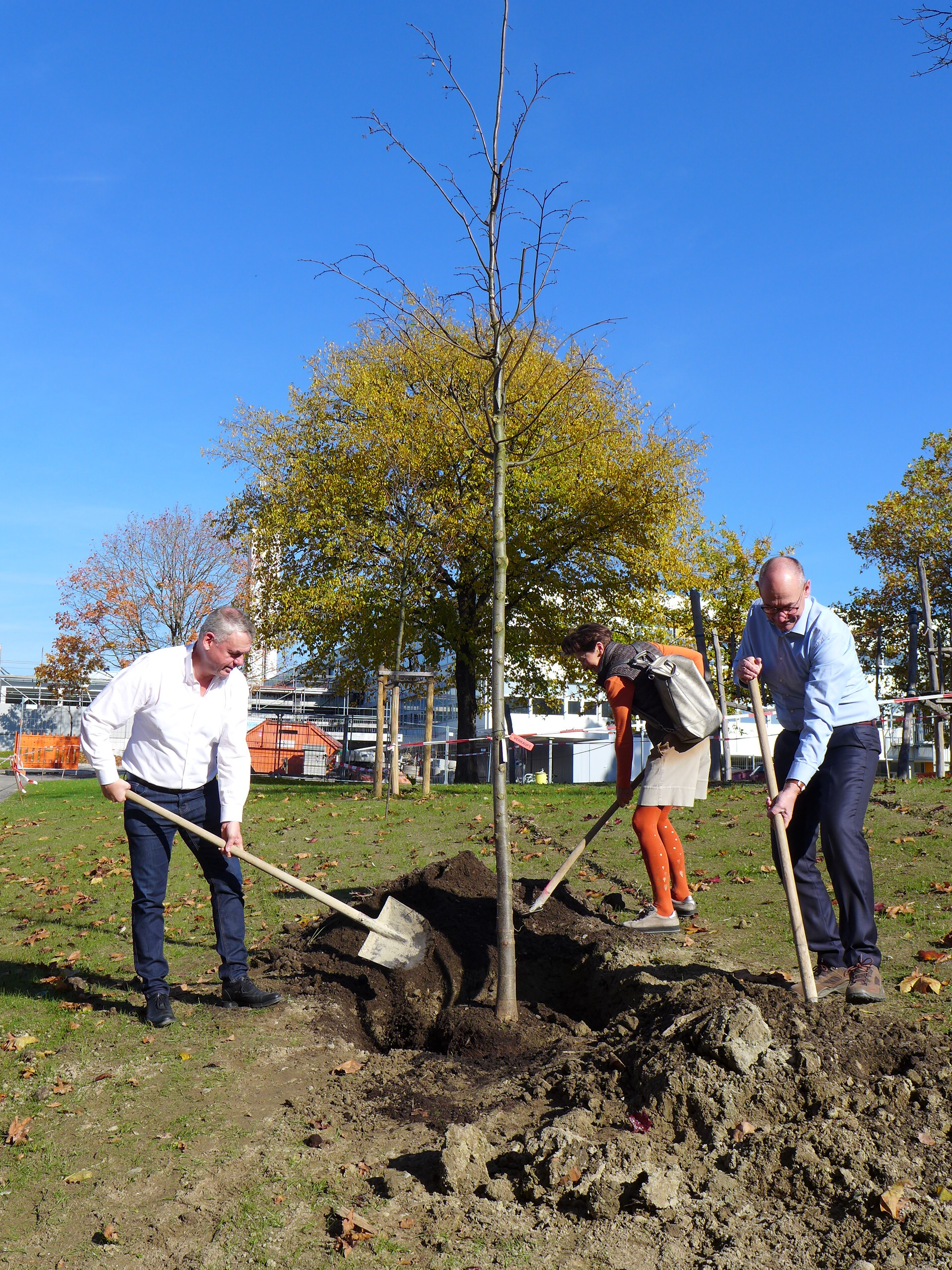 Bildinfo: Der „Baum des Publikums“ wurde am 27. Oktober 2021 auf dem Gelände des Bildungszentrums Markdorf durch Kulturamtsleiter Dr. Stefan Feucht, die Künstlerin Marlies E. Glaser und Landrat Lothar Wölfle (v.l.) gepflanzt.