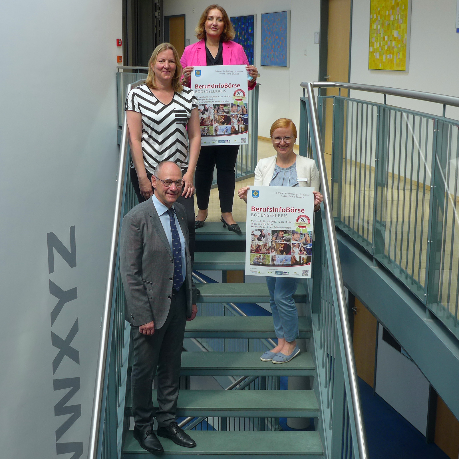 Bildinfo: Von unten nach oben: Freuen sich auf die 20. Auflage der BerufsInfoBörse: Landrat Lothar Wölfle, Simone Riedl von der Bildungsregion Bodenseekreis, Kristina Rex vom Organisationsteam der Droste-Hülshoff-Schule und Angelika Seitzinger, Schulleiterin der Droste-Hülshoff-Schule. Foto: Landratsamt Bodenseekreis