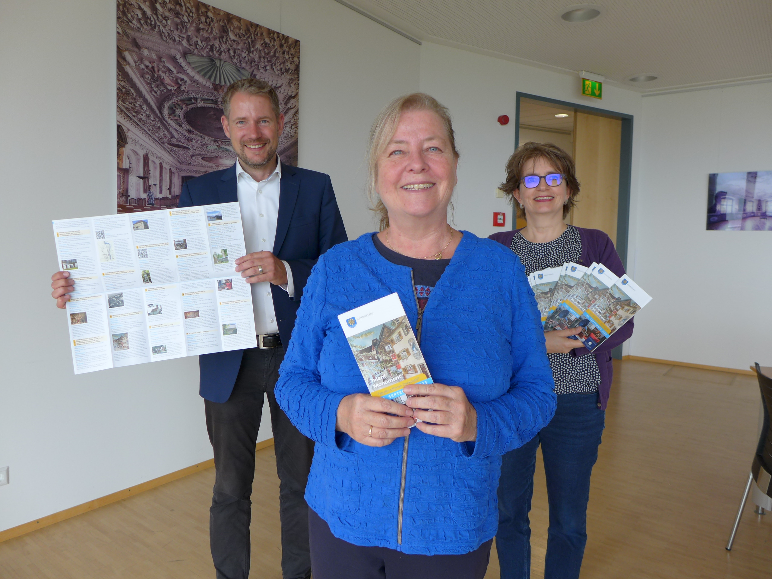 Bildinfo: Landrat Luca Wilhelm Prayon präsentiert gemeinsam mit Kreisarchivarin Dr. Evelin Dargel (vorn) und Projektkoordinatorin Brigitte Mohn das Programm des Tags des offenen Denkmals im Bodenseekreis. Sie laden die Bürgerinnen und Bürger dazu ein, 23 historische Orte im Landkreis zu entdecken, die teilweise sonst gar nicht öffentlich zugänglich sind. Foto: Landratsamt Bodenseekreis