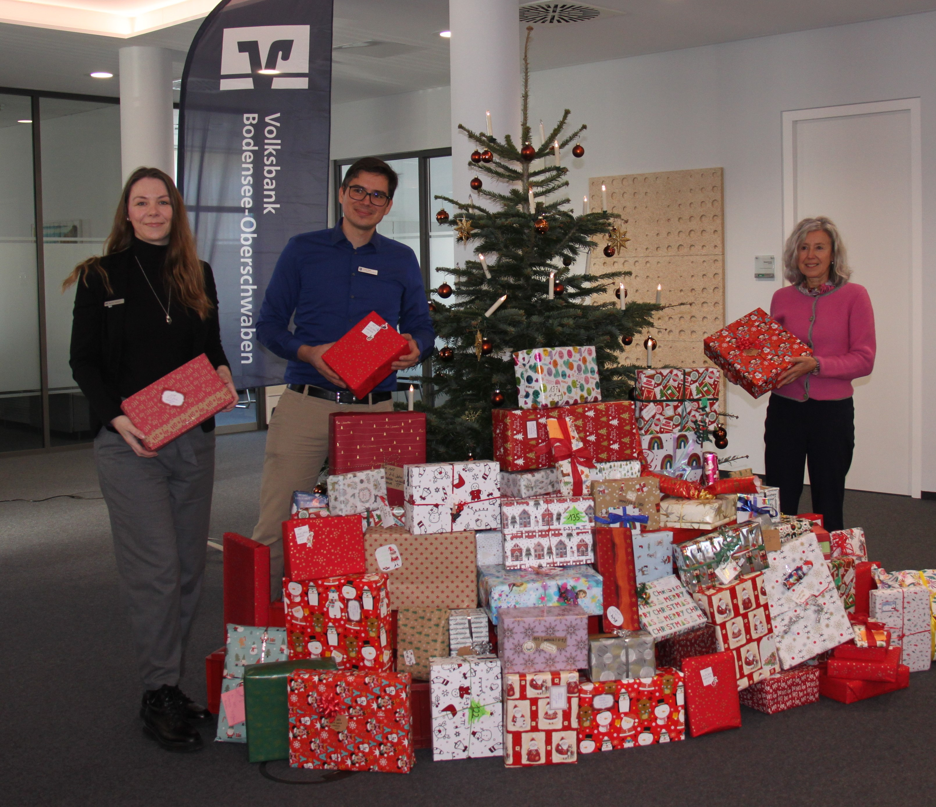 In der Vorweihnachtszeit haben Mitarbeiterinnen und Mitarbeiter der Volksbank Tettnang und Friedrichshafen eine besondere Initiative gestartet, um Kindern in Unterkünften für Geflüchtete eine Freude zu machen. 62 individuell ausgesuchte und liebevoll verpackte Weihnachtsgeschenke haben sie vorbereit und dem Amt für Migration und Integration des Bodenseekreises übergeben. Anhand einer anonymisierten Liste mit Informationen zu Geschlecht, Altersgruppe und Unterbringungsort der Kinder suchten die engagierten Banker jeweils für ein Kind ein individuelles Geschenk aus. Am 17. Dezember übergab das Volksbank-Team die bunten Pakete an Kollegen des Landratsamts. Nun werden die Geschenke in den einzelnen Gemeinschaftsunterkünften in Friedrichshafen, Tettnang, Langenargen, Kressbronn und Meckenbeuren sortiert und noch vor Weihnachten an die Familien übergeben.