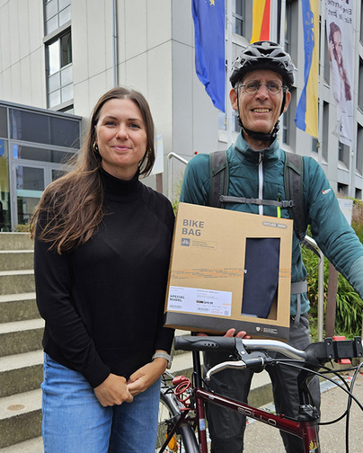 Bildinfo: Radverkehrskoordinatorin Sarah Wingendorf hat STADTRADELN-Gewinner Sven-Erik Sonntag eine Fahrradtasche als Preis übergeben. Er war mit 2.274 Kilometern bester Einzelradler.