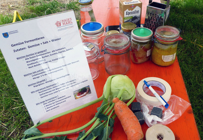 Nach Belieben kann eigenes Gemüse mitgebracht werden: Fermentiert werden kann eigentlich alles, was der eigene Garten hergibt oder auf dem Markt und im Supermarkt erhältlich ist. Beispielsweise Kürbis, frischer Ingwer, rote Bete, Karotten, Rettich, Äpfel oder Zwiebel und Kohl. Wer mag kann auch Chilischote, Paprika, Curry als Gewürze mitverwenden.