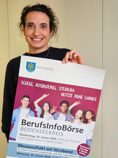 Bildinfo: Anne Beinder vom Team des Bildungsbüros Bodenseekreis lädt Schülerinnen und Schüler sowie Eltern zur großen BerufsInfoBörse mit über 100 Ausstellungsbetrieben am 28. und 29. Januar 2026 ins Friedrichshafener Graf-Zeppelin-Haus ein. Foto: Landratsamt Bodenseekreis