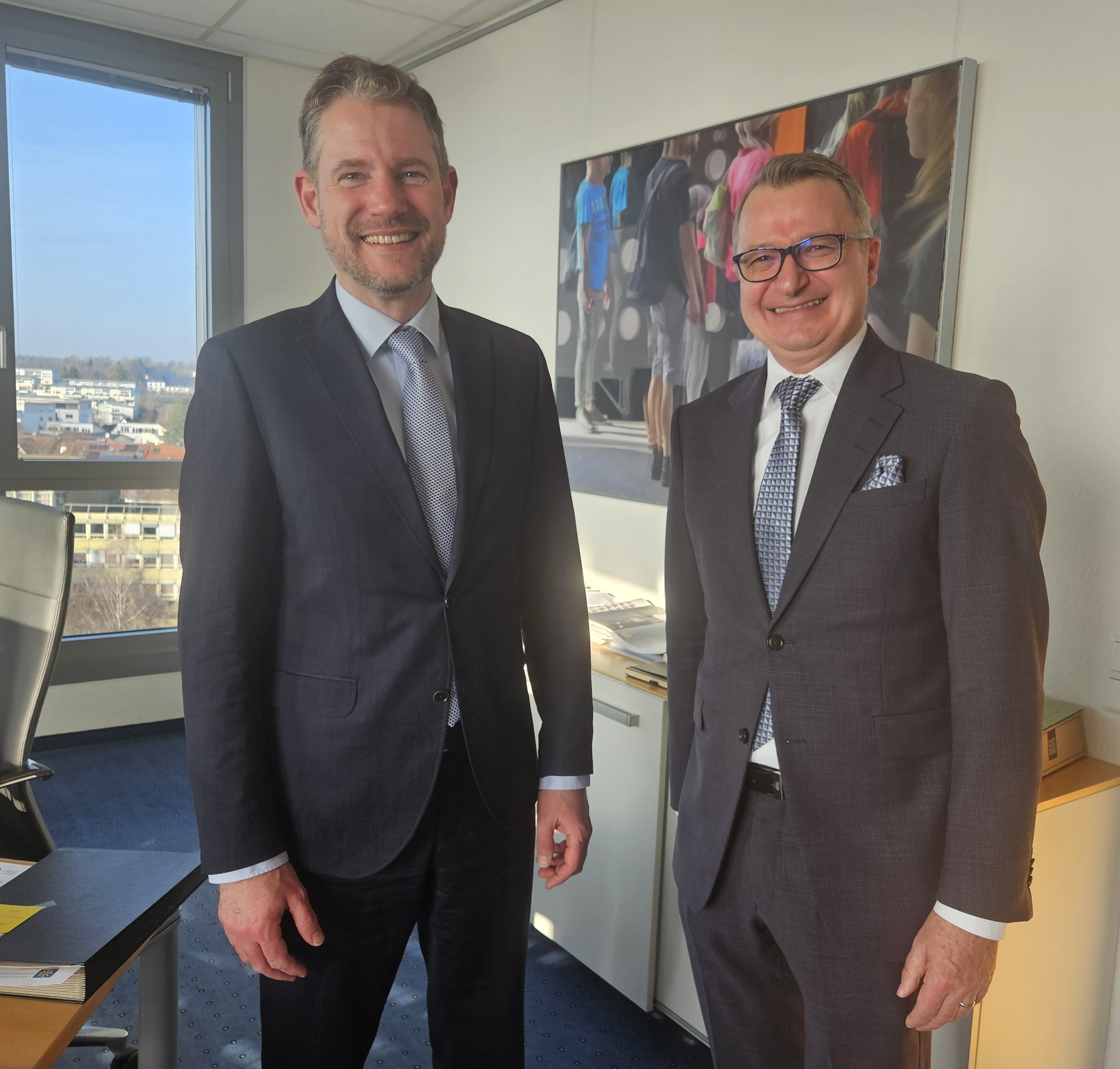 Der neue Schweizer Generalkonsul in Baden-Württemberg, Istvan Kocsis, war am 19. Januar 2026 zu Gast bei Landrat Luca Wilhelm Prayon im Landratsamt Bodenseekreis. Das Treffen diente vor allem dem Kennenlernen, um bei künftigen Themen gut und vertrauensvoll zusammenzuarbeiten. Traditionell gibt es in der Bodenseeregion viele konkrete Berührungspunkte, angefangen beim Bodensee als verbindendes Element, bis hin zu den hier lebenden und arbeitenden Menschen mit Wurzeln in beiden Ländern. „Die seeumfassende Freundschaft in der Region ist gelebtes Europa. Die formelle Klammer dafür ist die Internationale Bodenseekonferenz IBK“, sagt dazu der Landrat. So waren beispielsweise der Nahverkehr, Tourismus und die bestehende Abfallpartnerschaft mit der Schweiz Themen des einstündigen Gespräches.