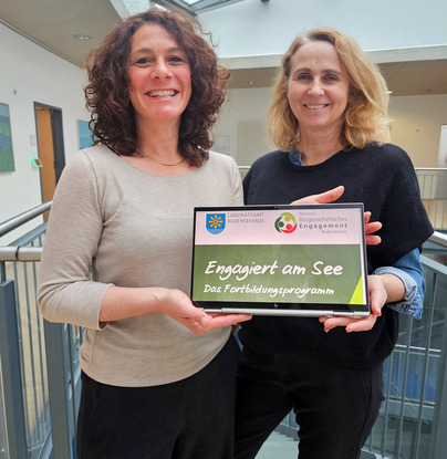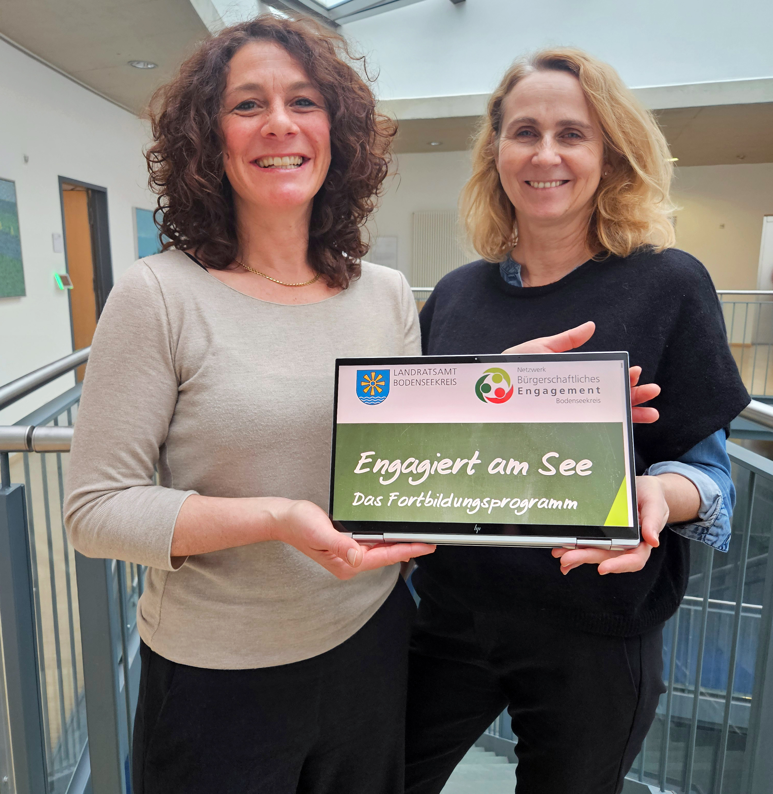 Bildinfo: Nadja Gauß (links) und Miriam Moll von der Servicestelle für bürgerschaftliches Engagement machen auf das neue Ehrenamts-Fortbildungsprogramm aufmerksam. Foto: Landratsamt Bodenseekreis