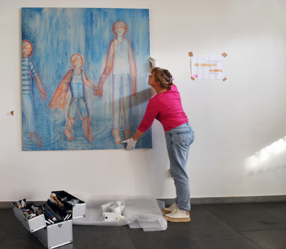 Bildinfo: Restauratorin Michaela Berge-Hänel beim Aufbau der Förderpreis-Ausstellung im Roten Haus Meersburg. Foto: Landratsamt Bodenseekreis