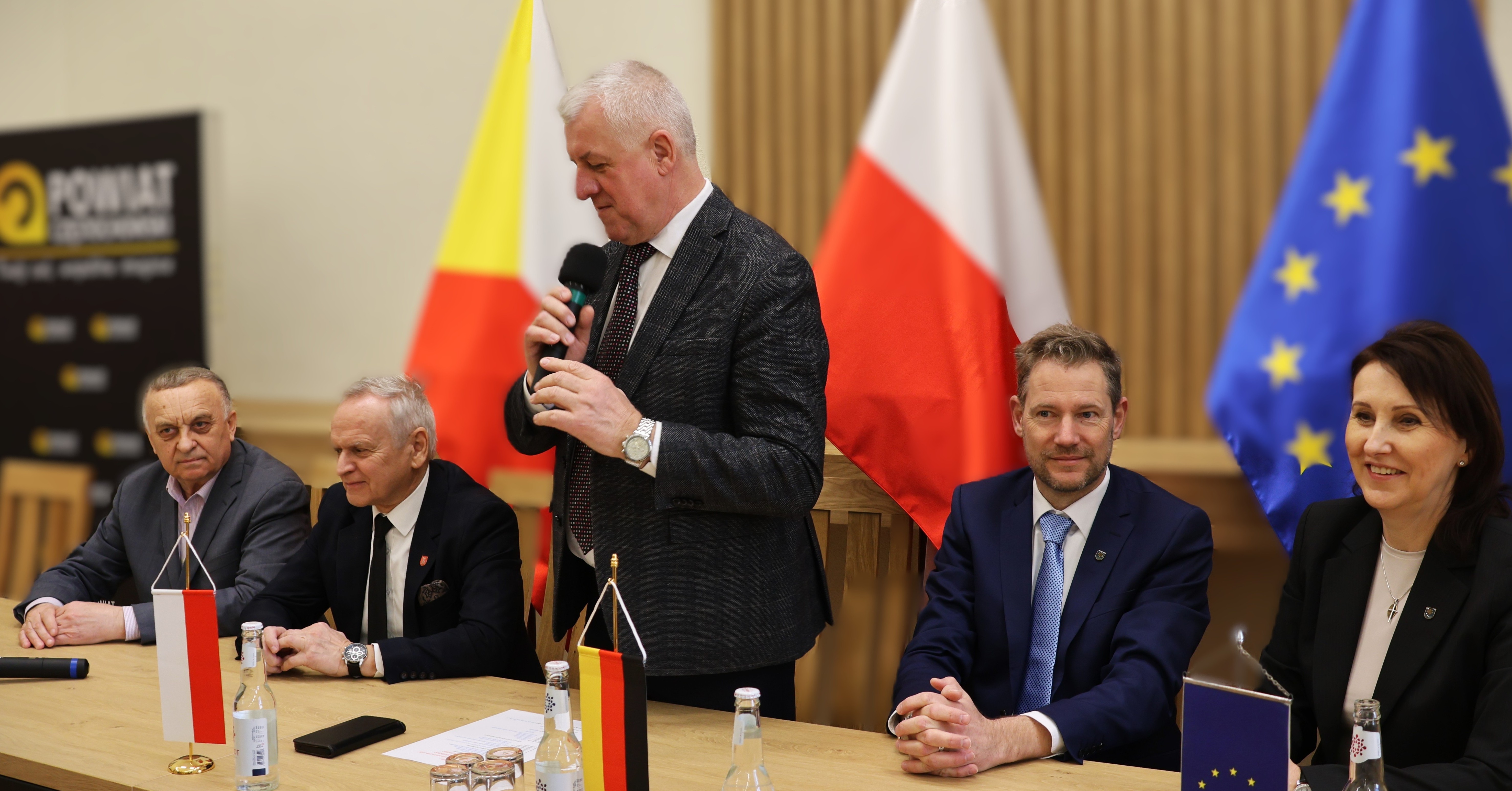 Bildinfo: Kommunalpolitischer Austausch im Landratsamt Tschenstochau. (v.l.: Dmytri Samulak, Stellvertretender Vorsitzender des Kreistages des Landkreises Kolomyja (Ukraine), Andrzej Kubat, Vorsitzender des Kreistages des Landkreises Tschenstochau, Landrat Krzysztof Smela (Landkreis Tschenstoschau), Landrat Luca Wilhelm Prayon (Bodenseekreis), Katharina Zlotos, Partnerschaftsbeauftragte für den Bodenseekreis.)
