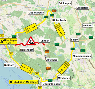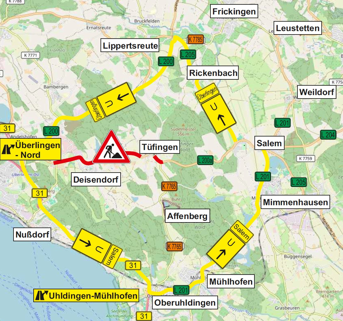 Während der Maßnahme muss der überörtliche Verkehr weiträumig umgeleitet werden. Die Umleitung des Verkehrs von Überlingen nach Salem erfolgt über die B 31 in Richtung Uhldingen-Mühlhofen und von dort weiter über die L 201 nach Salem. Die Umleitung des Verkehrs von Salem nach Überlingen erfolgt über die L 205 nach Rickenbach und von dort weiter über die L 200 nach Überlingen. Das Regierungspräsidium Tübingen bittet die Verkehrsteilnehmenden um Verständnis für die mit der Maßnahme zusammenhängenden Beeinträchtigungen.