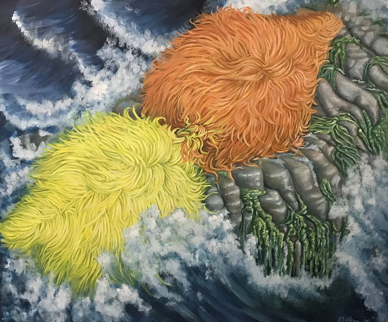 Tabitha Rub ist fasziniert von Oberflächen. Da werden z. B. weiche, flauschige Objekte einem harten, glatten Untergrund entgegengesetzt. Dadurch entsteht Spannung. Mithilfe der Eitempera-Technik entsteht durch die vielen Schichten Tiefe im Bild. Diese Arbeiten sind stark emotional geprägt.