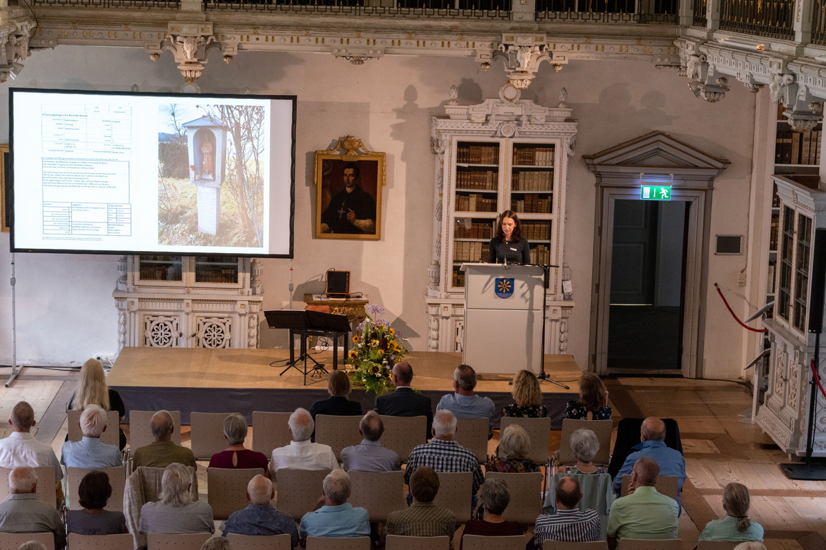 Nach mehr etwas mehr als drei Jahren intensiver Arbeit konnte die Erfassungsaktion im Bodenseekreis erfolgreich abgeschlossen werden. Über 100 Bürgerinnen und Bürger haben im Ehrenamt 3029 Kleindenkmale im gesamten Kreisgebiet flächendeckend erfasst. Damit verfügt der Bodenseekreis erstmals über eine umfassende Dokumentation seiner Kleindenkmale. Die Abschlussfeier des Projektes Kleindenkmalerfassung im Bodenseekreis fand in der Historischen Bibliothek im Schloss Salem statt. Es sprachen der damalige Landrat Lothar Wölfle, Landeskoordinatorin Martina Blaschka, Kreisarchivarin Dr. Eveline Dargel sowie Silja Maucher, Datenerfasserin beim Landesamt für Denkmalpflege. Künstlerisch umrahmt wurde die Veranstaltung durch das Ensemble „Projekt Resonance“ von Alain Wozniak (Flöte) und Péter Bácsi (Gitarre).