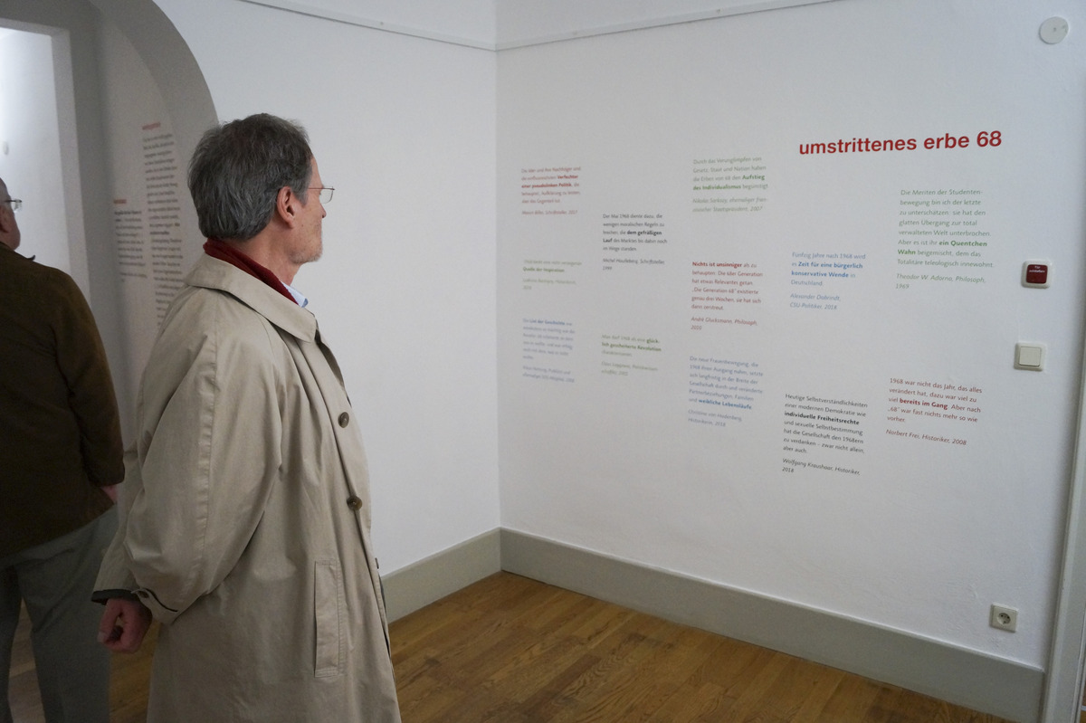 Anhand von Fotos, Filmen, Dokumenten, Objekten und Zeitzeugenaussagen bietet die Schau eine Bestandsaufnahme zahlreicher kaum bekannter Ereignisse dieser Zeit, die belegen wie sehr die Protestbewegung auch in den Regionen angekommen war. Zudem wirft die Ausstellung einen Blick auf kulturelle Veränderungen in der Region wie sie in der Musik, der Kunst und in der Literatur sichtbar wurden. Gezeigt werden Kunstwerke von Ulrich Bernhardt, Diether F. Domes, Martin Heilig, Max Peter Näher und Jan-Peter Thorbecke.