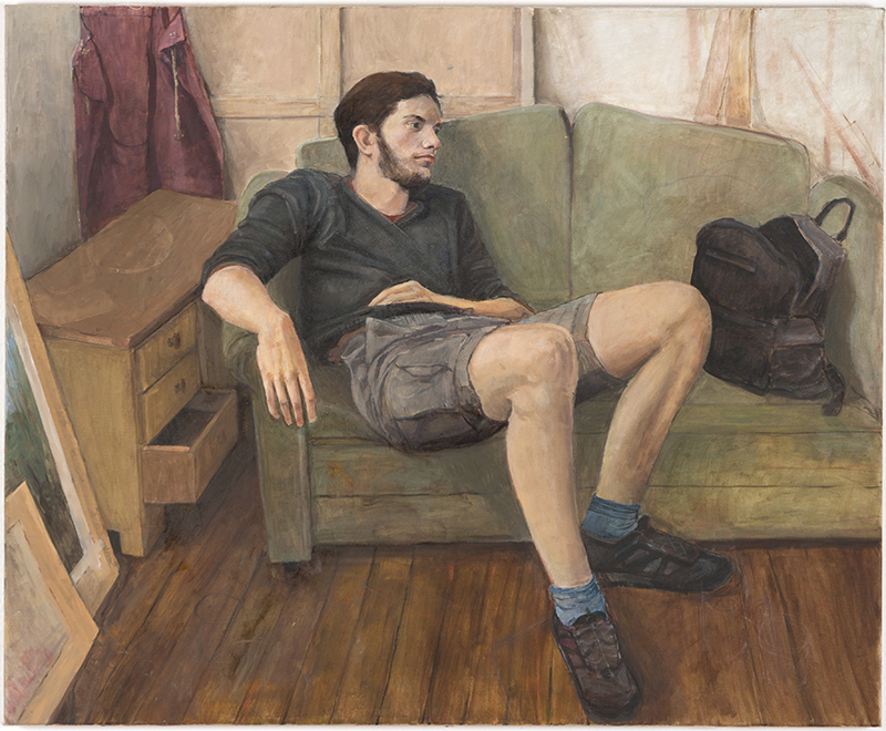 Die drei Gemälde spiegeln mein generelles Interesse am Menschen und dessen Umfeld wider. In Komposition und figürlicher Darstellung erinnern sie an altmeisterliche Vorbilder, die aber nicht bewusst als Vorlage dienen. Bei Helena und Atelierbesuch handelt es sich um Besuche meiner Geschwister. Zuerst entstand Helena. Besondere Liebe gilt hier dem Gesicht, das dem Bild seine Seele verleiht. Trotzdem ist der Raum keineswegs unwichtig. Helena ist umgeben von Dingen des Lebens wie einer Tasse, dem Handy, Schmuck und Büchern, einem Foto und Malerpinseln. Alltägliche Dinge, die aber in ihrer Zusammensetzung merkwürdig und widersprüchlich erscheinen. Jedes Utensil scheint auf eine eigene Fährte zu führen. Auf diese Weise soll das Gemälde nicht bloß als Porträt funktionieren, sondern auch als Allegorie oder Geschichte. Ähnlich verhält es sich beim Atelierbesuch. Der Raum ist ganz anders, schlichter, puritanischer, fast ein wenig düster, und hat doch etwas von einem Stillleben mit eigener Symbolik. Hier reiht sich auch das Selbstporträt mit Malerschürze ein, obwohl bei diesem der Fokus alleine auf der Dargestellten liegt.