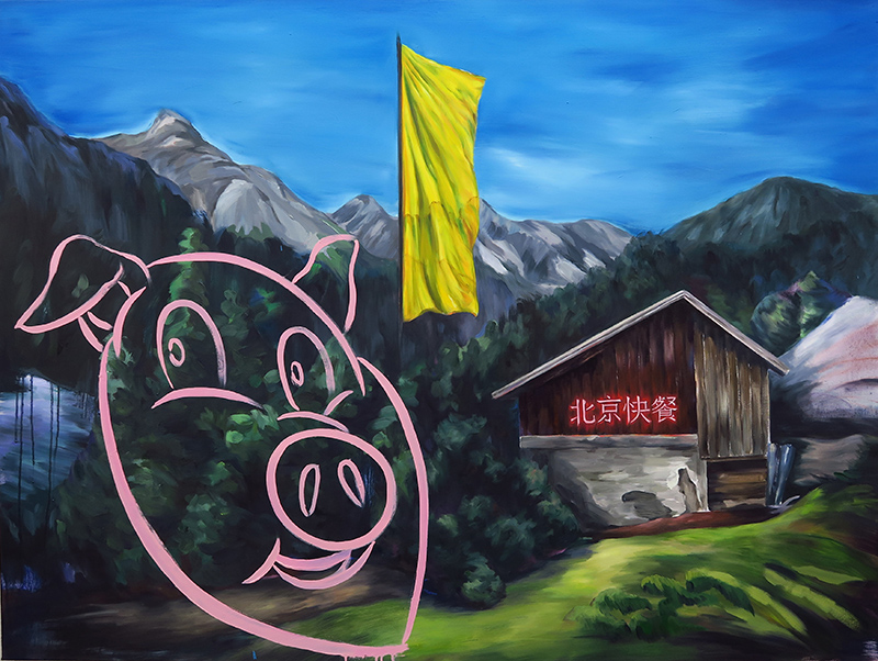 Meine Werke sind als Kritik an unserer aktuellen kapitalistischen Gesellschaft zu verstehen. Ich versuche, Themen wie Massentierhaltung, Umweltverschmutzung und Rechtspopulismus ironisch, übertrieben und zum Teil unverständlich darzustellen. Denn sie sollen auf den Menschen so wirken wie die aktuelle Gesellschaft: keine klare Trennung zwischen Gut und Bose, richtig und falsch. Take Away Welcome thematisiert die Massentierhaltung und verweist als Slogan auf die Schnelllebigkeit der heutigen Konsumgesellschaft und auf die darunter leidenden Tiere. Die grellen Farben und die willkürliche Aneinanderreihung unterschiedlicher Motive assoziieren die Aushängeschilder der Schnellimbisse einer belebten Straße. Inhaltliche Aspekte treffen auf Elemente aus fremdem Kontext, die einen starken Kontrast bilden. Dadurch erscheinen die Bilder häufig wie ein Bild im Bild und wirken wie rätselhafte Spiele zwischen Realität und Fiktion. Das Bild im Bild greife ich als formales Konzept seriell in vielen meiner Arbeiten auf. Als Techniken verwende ich Malerei, Zeichnung, verschiedene Drucktechniken und Collagen.