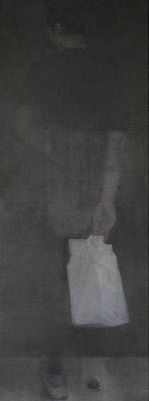 Wenn ich im Alltag Menschen beobachte, begegnen mir müde Gesichter und Körper, die schwach und erschöpft wirken. Meine Arbeit ist angetrieben von dem Wunsch, dieser Wahrnehmung und meinen zwischenmenschlichen Beziehungen nachzuspüren. Unschärfe und ein Gefühl von Unsicherheit: Grün und Schwarz ergeben den grauen Ton, der in meinen Malereien immer wiederkehrt. Eine Nicht-Leere füllt den Bildraum. Die Darstellung von menschlichen Körpern wird gebrochen und überlagert von Farbflächen.