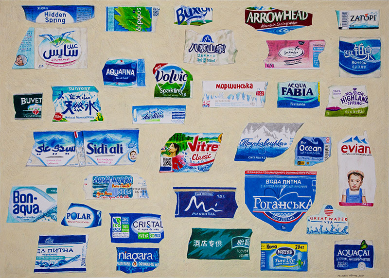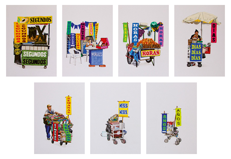 Ausgangspunkt der Serie von Zeichnungen Different Times war die Beobachtung von Straßenverkäufern in Kolumbien. An Ständen mit der Aufschrift Minutos können Handys minutenweise gemietet werden. In den Zeichnungen habe ich dieses Angebot weitergedacht und auf alle Zeiteinheiten zwischen Sekunden und Jahren ausgedehnt. Die Arbeit Mark Rothko – All Works on Canvas, zeigt chronologisch alle Werke Mark Rothkos, die er auf Leinwand gemalt hat. Sie beginnt mit seinem frühen gegenständlichen Werk und zeigt die komplette Entwicklung hin zu den späten abstrakten Arbeiten. Die gesamte Lebensgeschichte des Künstlers wird hier in einem Bild vereint. Die Zeichnung Seascape (Seestück) basiert auf meiner Sammlung von Etiketten von angespülten Wasserflaschen. Diese fand ich bei Reisen an Stränden in Südamerika, Nordamerika, Asien, Afrika und Europa.