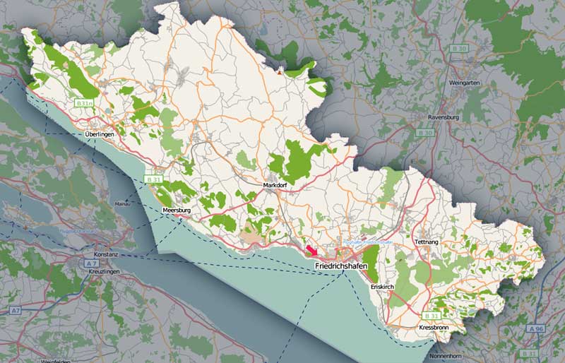 Der Bodenseekreis erstreckt sich entlang des nahezu gesamten baden-württembergischen Nordufers des Bodensees, grob beschrieben sechs bis 18 km Richtung Nordosten ins Oberschwäbische Hügelland bzw. im Osten in das Westallgäuer Hügelland. Der Umfang seiner Außengrenze beträgt 217 km, davon 57,7 Kilometer Bodenseeufer. Auf einer Fläche von 664,72 km² leben rund 220.000 Menschen in 23 Städten und Gemeinden. Damit ist der Landkreis verhältnismäßig dicht besiedelt. In den vergangenen zehn Jahren ist die Bevölkerung zudem stetig gewachsen.