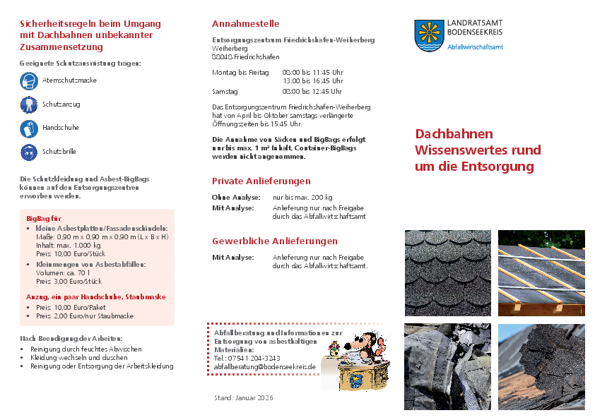Aufgrund der geänderten Annahmebedingungen unseres Verwerters für teerhaltige Produkte (Dachbahnen, Teerkork etc.), können diese Abfälle ab sofort im Entsorgungszentrum in Friedrichshafen-Weiherberg, nur noch in staubdicht verschlossenen BigBags (Maße ca. 0,9m x 0,9m x 1,1m) angenommen werden.