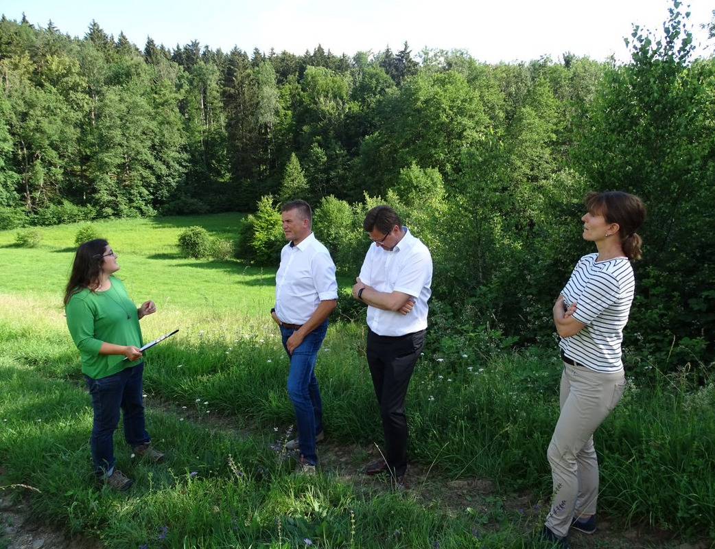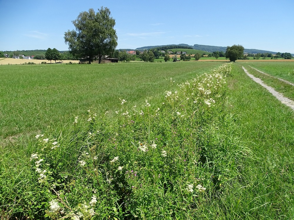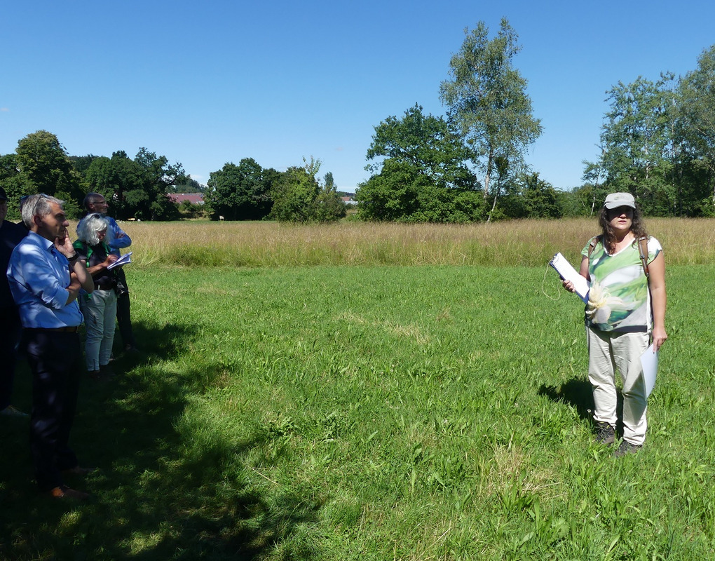 Seit etwa zwei Jahren nimmt das Thema der Wiederherstellung von verschlechterten Mageren Flachland-Mähwiesen (so genannten FFH-Mähwiesen), die ihren Status als FFH-Lebensraumtyp verloren haben, einen großen Anteil der Arbeit des LEV Bodenseekreis ein. Besonderer Nachdruck wurde dieser schwierigen Thematik verliehen, weil die EU-Kommission ein entsprechendes Vertragsverletzungsverfahren gegen Deutschland angestrengt hat und hier besonders Baden-Württemberg und Bayern mit großen Anteilen an FFH-Mähwiesen gefragt sind. Daher hat Jasmin Seif, die federführend die Rückholung der verloren gegangenen blumenbunten Magerwiesen insbesondere im westlichen und mittleren Kreis bearbeitet, das Thema bei der Exkursion zur Mitgliederversammlung anhand eines konkreten Beispiels im FFH-Gebiet „Argen und Feuchtgebiete bei Neukirch und Langnau“ ausführlicher vorgestellt. Erfreulich war dabei, dass die besuchte ehemalige Verlustfläche bei der diesjährigen Wiederholung der Offenland-Biotopkartierung wieder als FFH-Lebensraumtyp Magere Flachland-Mähwiese erfasst werden konnte. „So einfach wie hier an dieser mageren Fläche ist es im Bodenseekreis aufgrund der Boden- und Feuchtigkeitsverhältnisse aber meist nicht“, erläuterte die Stellvertretende LEV-Geschäftsführerin Seif an der wiederhergestellten FFH-Mähwiese stehend. Und sie führt tiefer in die schwierige Problematik ein: „In den allermeisten Fällen bei uns im Kreis haben wir übrigens keine Intensivierung als Verlustgrund nachweisen können“. Nichtsdestotrotz sähen die Vorgaben aus Stuttgart und Tübingen vor, dass in der Regel Rückholverträge mit den Bewirtschaftern geschlossen werden sollen, so dass die Landwirte die Flächen ohne Förderung in den artenreichen Zustand zurückversetzen sollen.