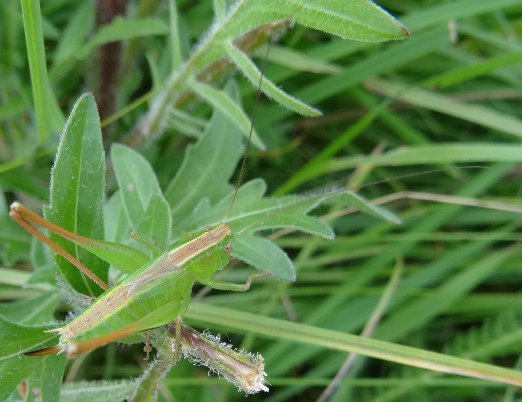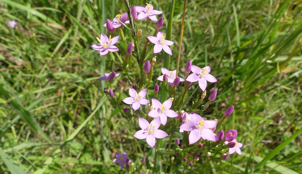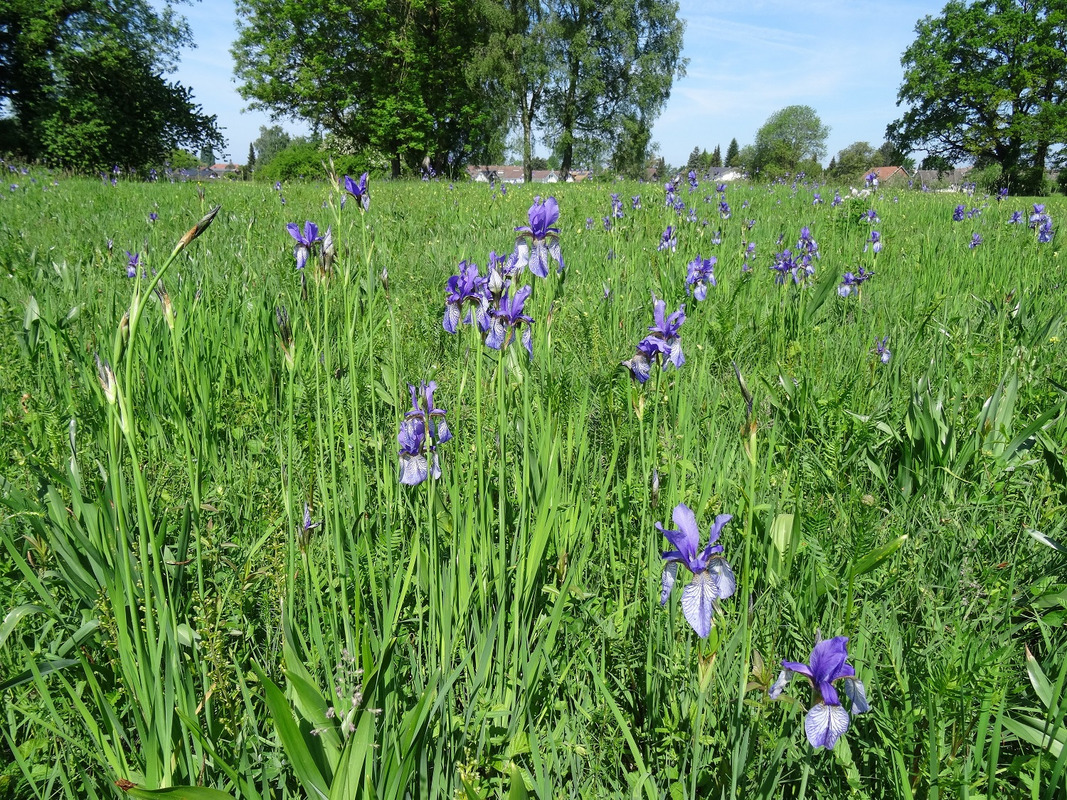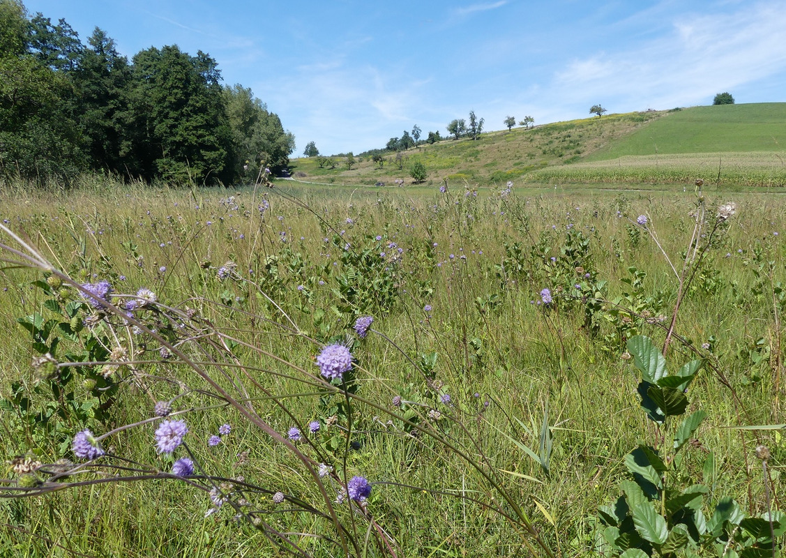 Direkt neben der wiederhergestellten FFH-Mähwiese liegt auf einer so genannten Brenne, also einem flussbegleitenden kiesigen Trockenstandort, eine ganz besonders artenreiche Grünlandfläche. Hier treffen Arten der trockenen Magerrasen wie verschiedene Orchideenarten auf Arten der (wechsel-)feuchten Pfeifengras-Streuwiesen wie den Weidenblättrigen Alant. „Diese besondere Artenvielfalt gilt es durch die richtige Pflege zu erhalten“, erklärte LEV-Geschäftsführer Daniel Doer, der vor einigen Jahren die Betreuung der Flächenpflege von der Naturschutzbehörde übernommen hatte. Neben einer einschürigen Mahd im Hochsommer gehören dazu auch ab und an weitergehende Maßnahmen wie eine im kommenden Winter geplante Gehölzwegnahme, um die Beschattung und den Laubeintrag in die magere und sonnige Fläche zu verringern. „Diese Fläche ist übrigens eine der Spenderflächen, auf der das Mähgut gewonnen wurde, mit dem die Stadt Tettnang die zuerst besuchte Ausgleichsfläche anlegen konnte“, fährt Landschaftsökologe Doer stolz fort.