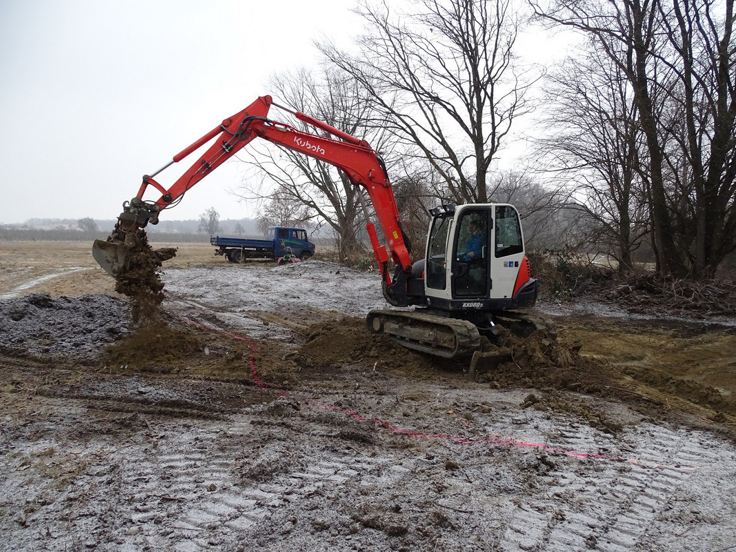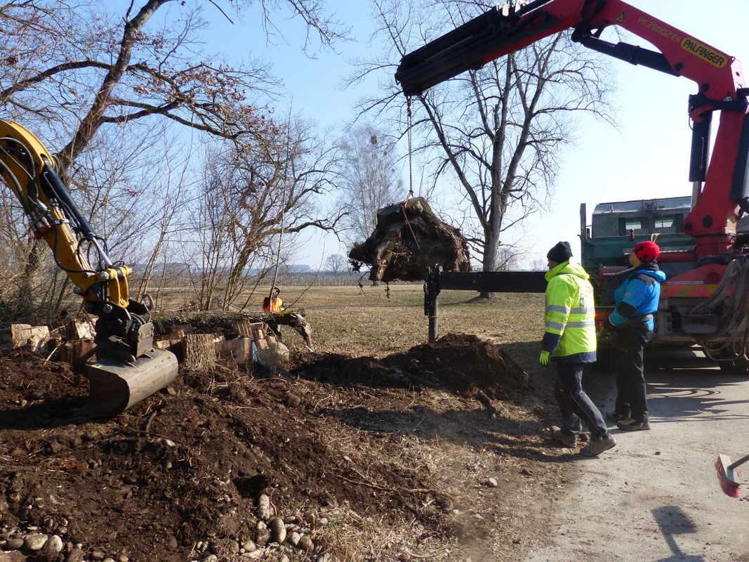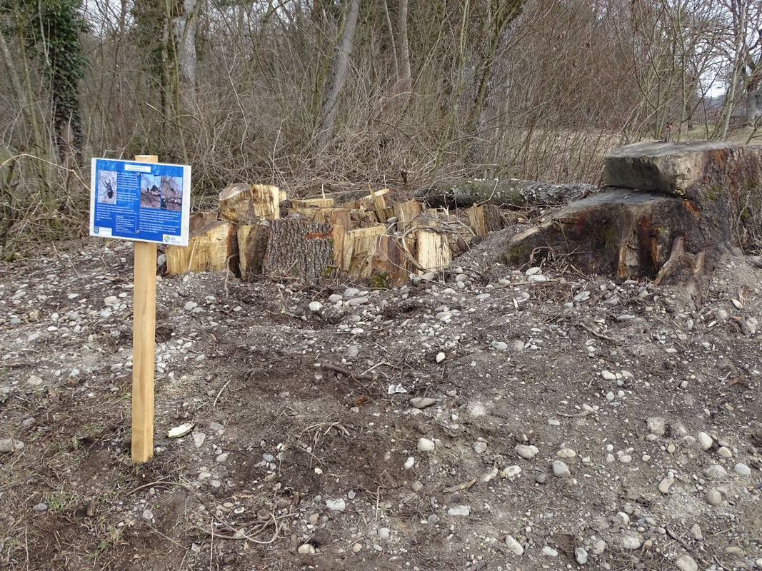 Da der Kammmolch besonnte Gewässer bevorzugt und sich die Larven im warmen Wasser schneller entwickeln können, wurden im Winter 2023/24 Gehölze am Rand von vier Kleingewässern im Auftrag des LEV entfernt. Edwin Strobel vom NABU Langenargen ist von diesen Maßnahmen angetan: „Ich freue mich, dass sich der LEV in den letzten Jahren so intensiv um dieses Gebiet und den Kammmolch kümmert“. Herr Strobel betreut diese Flächen seit den 1980er Jahren und hat auch die Anlage der Kleingewässer im Jahr 2007 angeregt. „Daher ist es sehr gut, dass der LEV jetzt mit den Maßnahmen den Lebensraum vom Kammmolch verbessert hat“, ist der NABU-Vertreter über die weitere Entwicklung erfreut. Nach dem bodennahen Absägen der Gehölze wurden auch die Wurzelstöcke gefräst, damit es nicht zu Stockausschlägen kommt. So wird nachhaltig verhindert, dass die Gebüsche Schatten auf die Gewässer werfen oder sie durch Laubeintrag beeinträchtigen.
