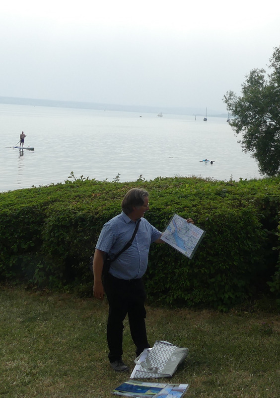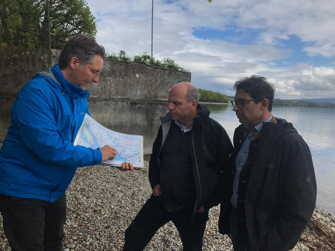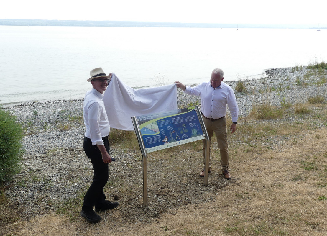 In einer anschließenden Exkursion an den Bodensee ging es zunächst an das Ufer zwischen Hagnau und Stetten. Teile des dortigen Hagnauer Ufers wurden vor etwa zehn Jahren - also vor dem Arbeitsbeginn der LEV-Geschäftsstelle - renaturiert, wie LEV-Geschäftsführer Daniel Doer kurz ausführte. Dort wurde eine erste Panoramatafel eines größeren Infotafelprojekts zum FFH-Gebiet „Bodenseeufer westlich Friedrichshafen“ aufgestellt. Die Infotafel zur Renaturierung wurde im Rahmen der Exkursion gemeinsam von den Bürgermeistern Volker Frede (Hagnau) und Daniel Heß (Stetten) feierlich enthüllt. Insgesamt werden acht Infotafeln entlang des Hagnauer und Stettener Bodenseeufers interessierte Gäste über Arten und Lebensräume des FFH-Gebietes informieren. „Auf Anregung aus der Bevölkerung wurde dieses Projekt von Bürgermeister Heß und mir angestoßen und konnte mithilfe der tollen Zusammenarbeit mit Herrn Doer vom LEV so ansprechend umgesetzt werden“, lobte Bürgermeister Frede die gute Kooperation zwischen Gemeinden und LEV.