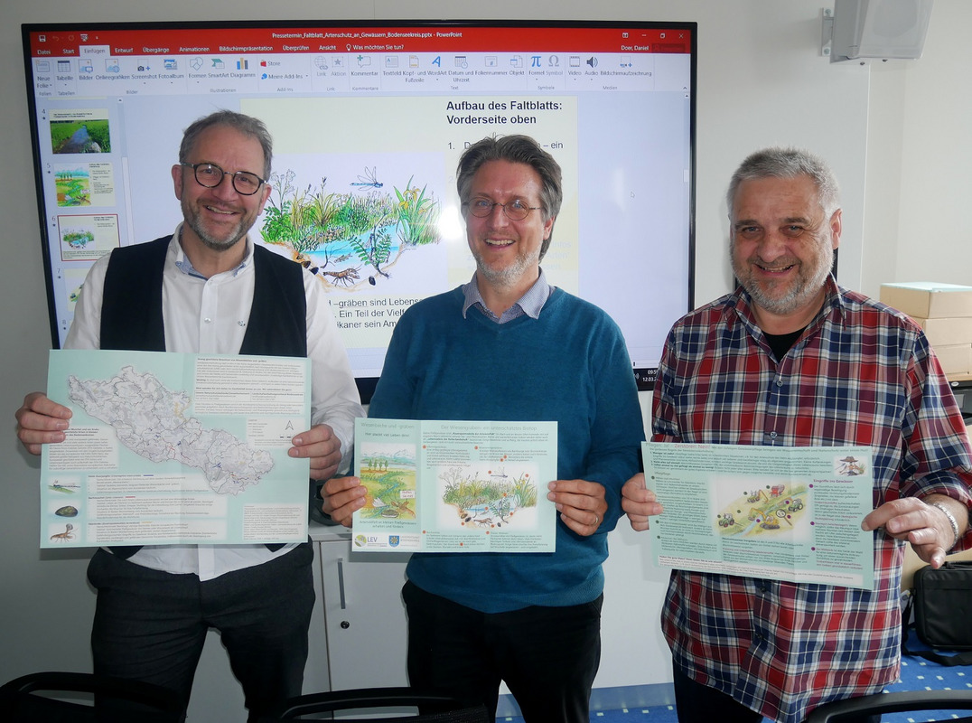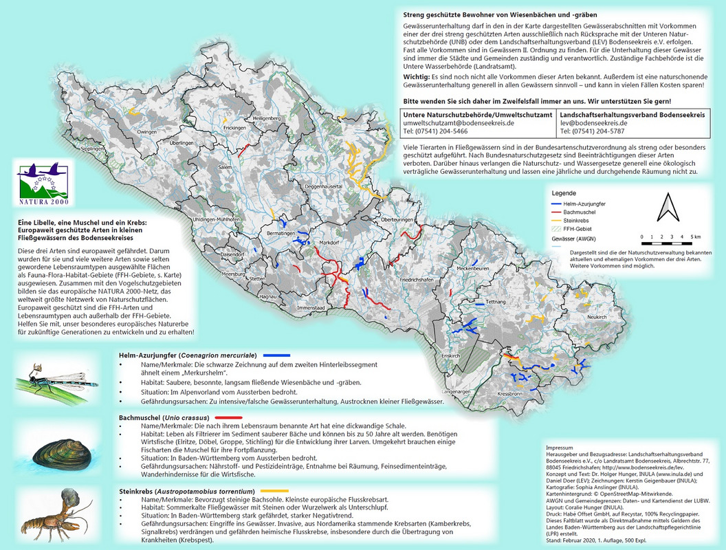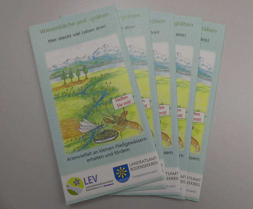 Der LEV Bodenseekreis wurde im Juli 2013, also vor zehn Jahren, gegründet. Aus Anlass seines 10-jährigen Bestehens präsentiert der LEV seine Arbeit vom 18. September bis 17. November 2023 in einer Ausstellung im Foyer des Landratsamts in Friedrichshafen (im Neubau, Albrechtstr. 77). Den Kern der Ausstellung bildet ein vom LEV-Geschäftsführer Daniel Doer zusammengestellter bunter Bilderreigen aus zehn Jahren LEV-Arbeit. In 222 großformatigen Bildern wird darin die Arbeit der LEV-Geschäftsstelle für Natur, Landschaft und Menschen im Bodenseekreis von 2014 bis 2022 dargestellt. Sozusagen titelgebend ist dabei das weltweit nur am Bodensee vorkommende Bodensee-Vergissmeinnicht, das europäisch geschützt ist und für dessen Schutz sich der LEV vom ersten Jahr an engagiert hat. Diese seltene Pflanzenart wurde deshalb in das Logo des LEV Bodenseekreis aufgenommen. Weitere Beispiele aus der Naturschutz-Arbeit betreffen Schutzmaßnahmen für die europäisch geschützte Libellenart Helm-Azurjungfer und weitere Bewohner kleinerer Fließgewässer. Exemplarisch werden auch Bilder des Goldenen Scheckenfalters gezeigt, einem sehr selten gewordenen Schmetterling der artenreichen Pfeifengras-Streuwiesen, für welchen im Jahr 2022 ein erfreulicher Artenschutzerfolg im östlichen Bodenseekreis zu verzeichnen war.