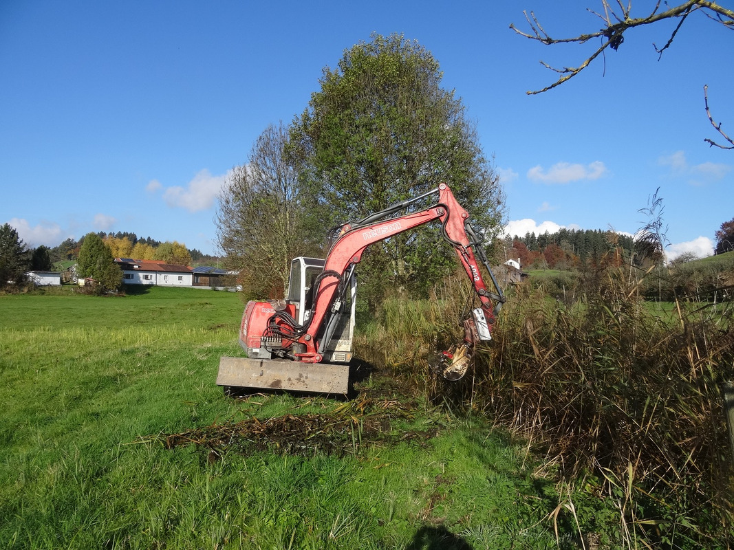 In den Anfangsjahren der Entwicklung vom landwirtschaftlichen Mischbetrieb mit Milchkühen und Obst hin zu einem spezialisierten Landschaftspflegebetrieb hat Thomas Müller viele Aufträge zur Entbuschung von ebenfalls schwierig befahrbaren und so teilweise aus der Nutzung gefallenen Feuchtgebieten im größeren Umkreis angenommen. „Zu dieser Zeit war er auch häufig in „unseren“ Mooren im Kreis Ravensburg unterwegs“, erzählt Robert Bauer, Geschäftsführer vom dortigen Landschaftserhaltungsverband. Thomas Müller schaffte sich als einer der ersten in der Region eine Wurzelstockfräse an und überzeugte die Auftraggeber, diese zum Vermeiden von Stockausschlägen auch in den Feuchtgebieten einzusetzen. Dieser einst innovative Ansatz ist heute gelebte Praxis bei allen Entbuschungen und viele Landwirte und Landschaftspflegeunternehmer bieten Stockfräse-Einsätze an. Auch auf seiner Fläche am Degersee hat Thomas Müller schon im Auftrag des LEV Entbuschungen mit anschließenden Stockfräse-Arbeiten vorgenommen, um unter anderem den Goldenen Scheckenfalter zu fördern (s. News-Meldung vom 17.11.2022).