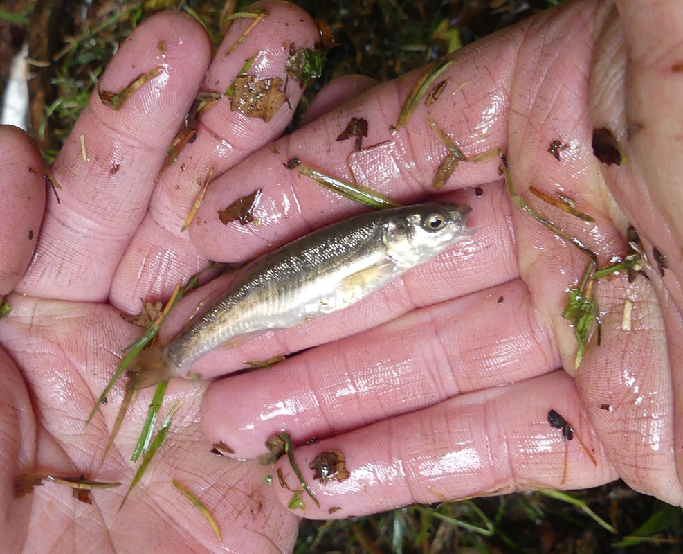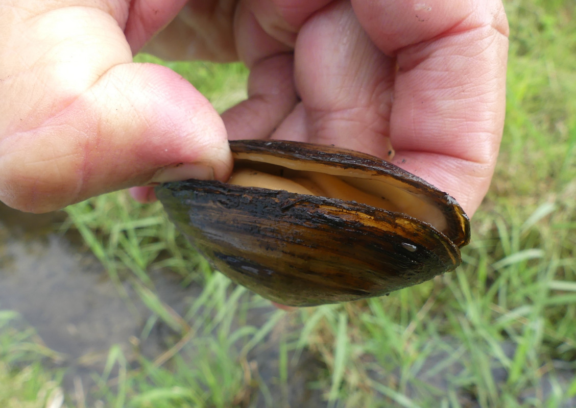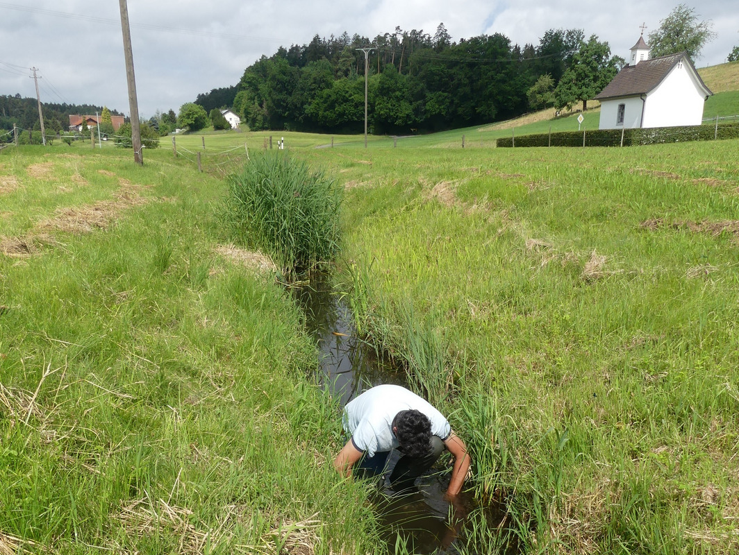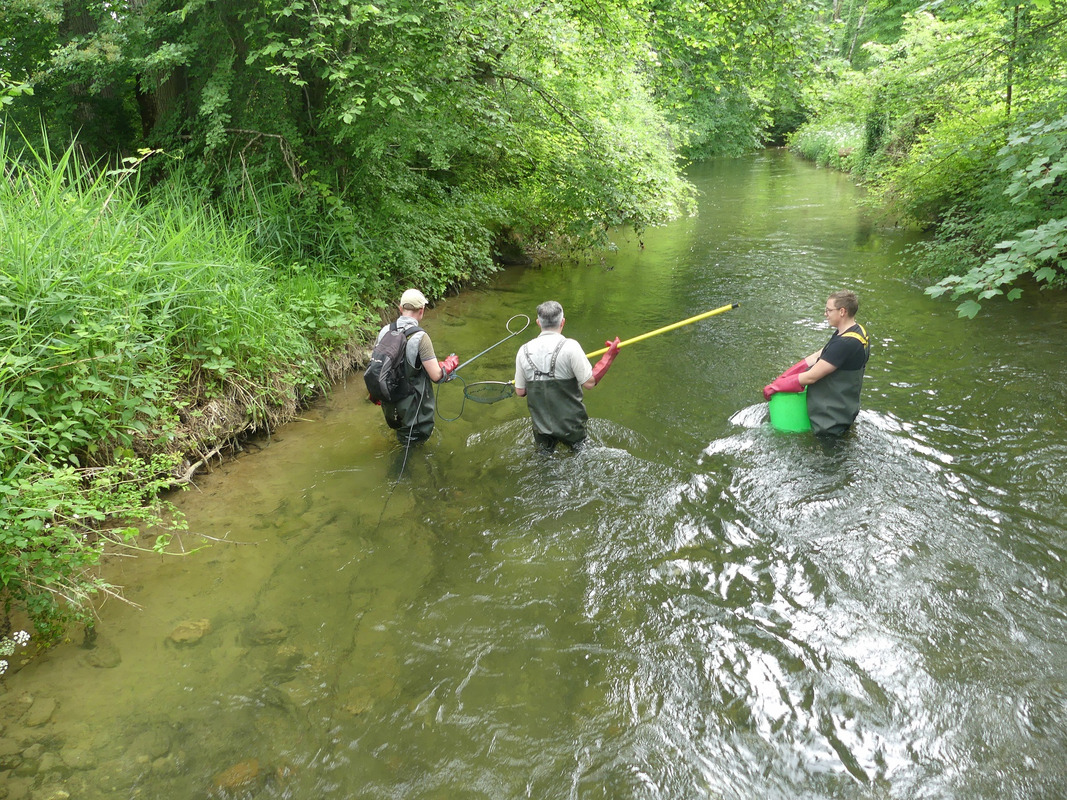 Im Juni wurde in der Fischereiforschungsstelle ein Larven abgebendes Bachmuschel-Weibchen mit den aus der Quarantäne entlassenen Döbeln, Elritzen und Dreistachligen Stichlingen zusammengebracht, um die Wirtsfische mit den von den Fachleuten Glochidien genannten Larvenstadien zu infizieren. Mitte Juni konnten so knapp 80 mutmaßlich infizierte Fische zusammen mit den weiblichen Muscheln in den Wielandsbach eingesetzt werden. Das geschah aber nicht, wie ursprünglich geplant, unterhalb vom Seeauslauf, sondern bei Unterwolfertsweiler, da hier die Gewässerstruktur besser geeignet erschien. Außerdem können die Fische von dort nicht so leicht in den Wielandsee abwandern, was für die Entwicklung der Bachmuscheln schlecht gewesen wäre. Die Kollegen vom Büro gobio schätzen, dass auf diese Weise mehrere hundert oder sogar tausend potenzielle Jungmuscheln erfolgreich in den Wielandsbach eingebracht werden konnten. Der langfristige Erfolg dieser Artenschutzmaßnahme für die Bachmuschel kann aber erst in ein paar Jahren durch ein wiederholtes Monitoring ermittelt werden.