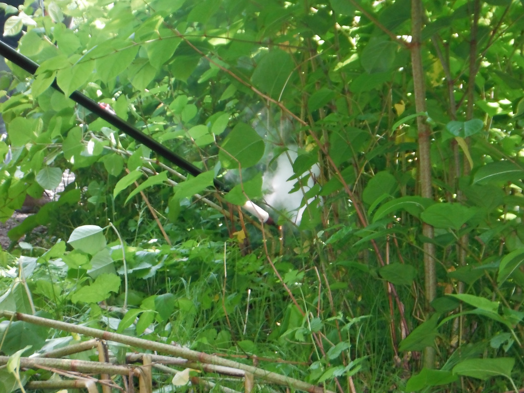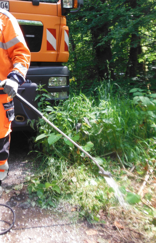 Nachdem Frau Seif, Organisatorin von Seiten des LEVs, zu Beginn der Veranstaltung eine Einführung in die Staudenknöterich-Arten (Japanischer, Sachalin- und Bastard-Staudenknöterich) und die Problemlage gab, wurden drei verschiedene Techniken zur Bekämpfung vorgestellt, demonstriert und diskutiert. Den Auftakt machte eine Elektrolanze, welche für die Firma Kersten Arealmaschinen GmbH von Maschinen Bader-Ritter GmbH & Co. KG vertrieben und vorgeführt wird. Mit dem Ende der Elektrolanze wird jede Pflanze jeweils berührt, wodurch ein Stromschlag durch die Pflanze und in die Wurzeln bzw. in das Rhizom abgegeben wird, was die Pflanze oberirdisch abtötet und das Rhizom schwächt. Später wurde als weitere potenzielle Technik das Heißwassergerät der Straßenmeisterei Markdorf eingesetzt und Staudenknöterich-Pflanzen überirdisch verbrüht. Für einen besseren Effekt muss mit einer Lanze in die Rhizome und in den Wurzelraum eingestochen werden, um auch die unterirdische Biomasse zu erreichen. In der Staudenknöterich-Bekämpfung ist die Heißschaum-Behandlung einer Heißwasser-Behandlung jedoch eindeutig überlegen, da durch den biologisch abbaubaren Schaum die Hitze länger auf der Pflanze verbleibt und wirken kann. Als dritte Technik wurde von Herrn Scheuber eine manuelle Bekämpfungsmethode gezeigt, die jedoch viel Handarbeit bedarf. Hierbei wird die Pflanze mit den Speicherorganen und Rhizomen soweit wie möglich ausgegraben. Das unterirdische Material wird eingesammelt, zwischengelagert (wobei auf dem Lagerplatz ein WiederAnwurzeln vermieden werden muss) und zum Jahresende verbrannt. Den personellen Aufwand für die rein händische Bearbeitung der Staudenknöterich-Pflanzen im Nachbarkreis deckt Herr Scheuber in Zusammenarbeit mit dem LEV Ravensburg seit 7 Jahren erfolgreich durch ehrenamtliche Mithelfer aus der Bürgerschaft ab, bspw. Schülerinnen/Schüler, Migrantinnen/Migranten, Naturfreundinnen/Naturfreunden und rüstige Seniorinnen/Senioren.