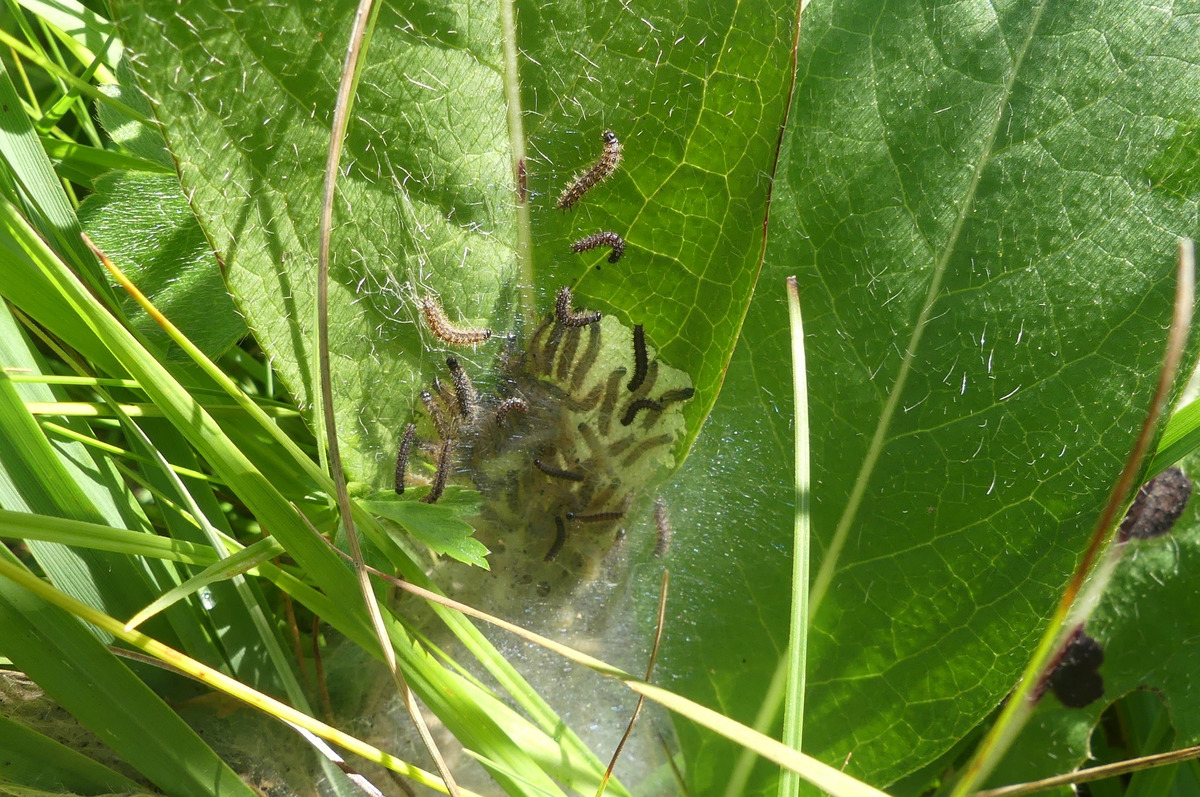 Der Goldene Scheckenfalter hat einen besonderen Lebenswandel: Die weitgehend einzige Futterpflanze der Raupen ist der Teufelsabbiss. Diese seltene Pflanzenart der Pfeifengras-Streuwiesen hat relativ große Blattrosetten. So legt ein Weibchen an einer Pflanze viele Eier ab, die daraus schlüpfenden Raupen fressen gemeinsam an den Blättern und bilden so genannte Raupengespinste an der Rosette aus. Der Fund von diesen Gespinsten sagt viel mehr über die erfolgreiche Fortpflanzung aus als fliegende Falter. Daher suchen die Mitarbeiter im Artenschutzprogramm (ASP) des Landes nach eben diesen Raupengespinsten. Im August 2022 durfte LEV-Mitarbeiter Doer sie dabei begleiten. „Wir haben in fast allen neuen Fluggebieten auch Raupengespinste vom Goldenen Scheckenfalter nachweisen können“, führt ASP-Bearbeiter Loritz aus. „Das Jahr 2022 war auch in anderen Kreisen in Oberschwaben ein sehr gutes Jahr für diese Art“, freut sich der freischaffende Ökologe und fährt fort: „Allein hier im NSG Hermannsberger Weiher wurde der Rekordwert von 211 Einzelgespinsten gezählt“. Für das langfristige Überleben des Goldenen Scheckenfalters ist eine so genannte Metapopulation aus vielen kleinen, ausreichend nah beieinander liegenden Vorkommen notwendig, welche einen genetischen Austausch zwischen den Teilpopulationen ermöglichen. „Die vielen Gebiete mit erfolgreicher Reproduktion im Raum Tettnang zeigen uns, dass hier vielleicht eine Metapopulation wieder aufgebaut werden konnte“, führt Daniel Doer den Hintergrund des Artenschutzerfolgs aus. „Auch wenn der gute Bestand im Frühjahr und Sommer 2022 nur ein Zwischenhoch gewesen sein sollte, so sehe ich der Zukunft des Goldenen Scheckenfalters im Bodenseekreis neuerdings deutlich optimistischer entgegen“, schließt der LEV-Geschäftsführer seine Erläuterungen ab. Um die weitere Entwicklung der gefährdeten Schmetterlingsart im Hermannsberger Weiher und anderen Gebieten positiv zu gestalten, wurden beim Pflegegespräch im Oktober Lebensraum verbessernde Maßnahmen, wie z. B. ein passender Mahdzeitpunkt, abgestimmt.