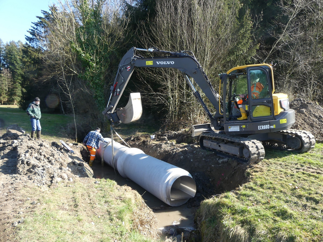 Um das große, neu gefundene Vorkommen des Steinkrebses vor einem weiteren Einwandern des Signalkrebses und damit Ansteckung zu schützen, entschied sich der LEV Bodenseekreis für den Einbau von Wanderbarrieren, so genannten Krebssperren. Bei der Planung des Einbaus arbeiteten Daniel Doer und Thomas Ueber (LEV) eng mit Thomas Bechter-Wild (Untere Wasserbehörde) und Ursula Riether (Stadt Tettnang) zusammen. Die Stadt Tettnang ermöglichte durch die Übernahme der Kosten für Material und Einbau die Realisierung der Krebssperre. Bei Ortsterminen mit landwirtschaftlichen Anrainern und einer Videokonferenz mit Krebsexperten wurden letzte Details geklärt. Die Krebssperren wurden Mitte März eingebaut, begleitet durch den Fischereiökologen Ralf Haberbosch (LPR-Auftrag). Die Mitarbeiter der Stadt Tettnang waren etwa eine Woche mit der heiklen Aufgabe beschäftigt, die alten Verdolungen zu entfernen und die neuen passgenau einzusetzen. Denn die eingebauten Krebssperren haben eine neue und innovative Bauart, bei der die Sperre in ein Betonrohr integriert wird.