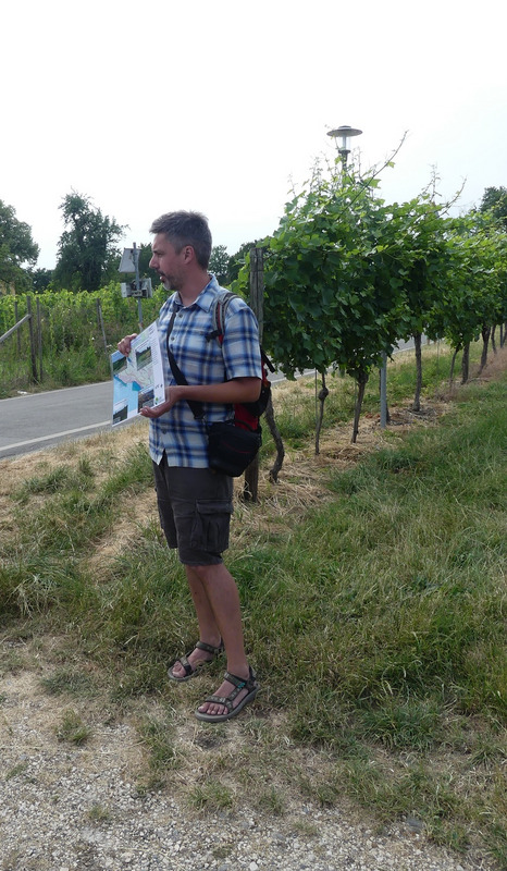 Im zweiten Teil der Exkursion erläuterte Herr Doer gemeinsam mit der Biologin Irene Strang von der Arbeitsgruppe Bodenseeufer (AGBU) die Bedeutung des Hagnauer Bodenseeufers für seltene und weltweit nur hier vorkommende Arten wie die Bodensee-Schmiele oder das Bodensee-Vergissmeinnicht. Diese Arten seien heute nur noch am Bodensee zu finden und Teil der seltenen Pflanzengesellschaft der Strandrasen, erläuterte Frau Strang und fuhr fort: „Es ist toll, dass wir zwischen Hagnau und Immenstaad noch einen so natürlichen Bodensee-uferabschnitt mit einem bedeutenden Vorkommen der endemischen Bodensee-Schmiele haben“. Herr Doer informierte die Gäste unter anderem über die Bedeutung der Flachwasserzone des Bodensees für Tiere und Pflanzen wie die FFH-Fischart Groppe oder die verschiedenen Arten der Armleuchteralgen. Dabei stellte er auch eine weitere, noch nicht im Gelände aufgestellte Infotafel zum in der gesamten Flachwasserzone vorkommenden FFH-Lebensraumtyp „Kalkreiche und nährstoffarme Stillgewässer mit Armleuchteralgen“ vor: „Dieser Lebensraumtyp bildet sozusagen das Rückgrat des hiesigen FFH-Teilgebiets“, führte Landschaftsökologe Doer aus. Zu guter Letzt erläuterte der LEV-Biotopverbundbotschafter Thomas Ueber in den Weinbergen von Hagnau den aktuellen Stand zur Biotopverbundplanung auf der Gemarkung bzw. im Gemeindeverwaltungsverband Meersburg: „Zwar gehören die Weinberge nicht zur eigentlichen Kulisse des landesweiten Fachplans Biotopverbund, trotzdem sind hier natürlich gut kleinflächige und freiwillige Maßnahmen denkbar.“