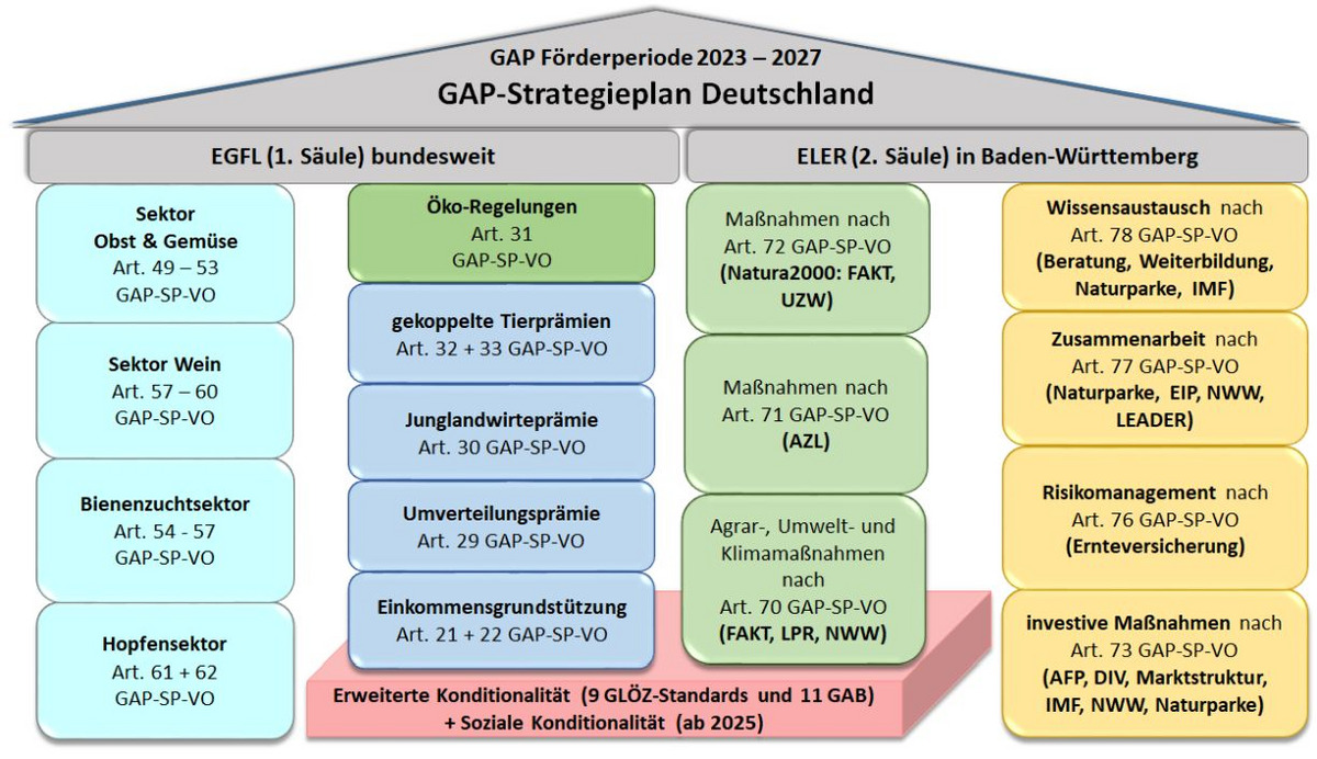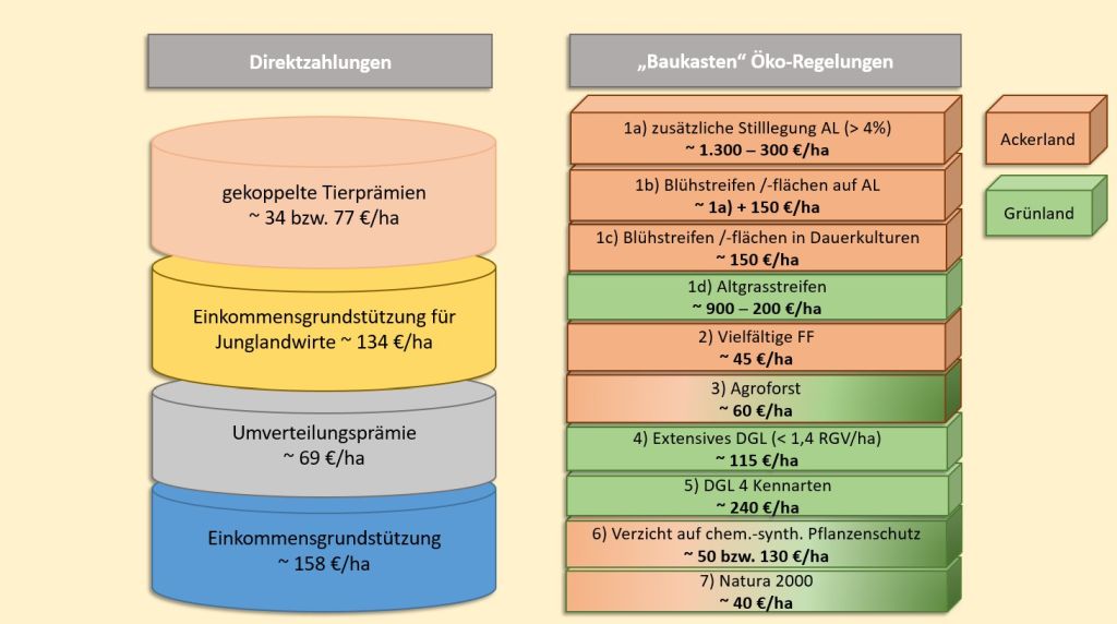 - Alle Mitgliedstaaten müssen künftig Öko-Regelungen anbieten, die für Landwirtinnen und Landwirte jedoch freiwillig sind. Sie sind bundeseinheitlich, einjährig und ihre Finanzierung erfolgt aus der ersten Säule der GAP. Deutschland wird sieben Öko-Regelungen anbieten und dafür 23 Prozent der Mittel der Direktzahlungen aufwenden.